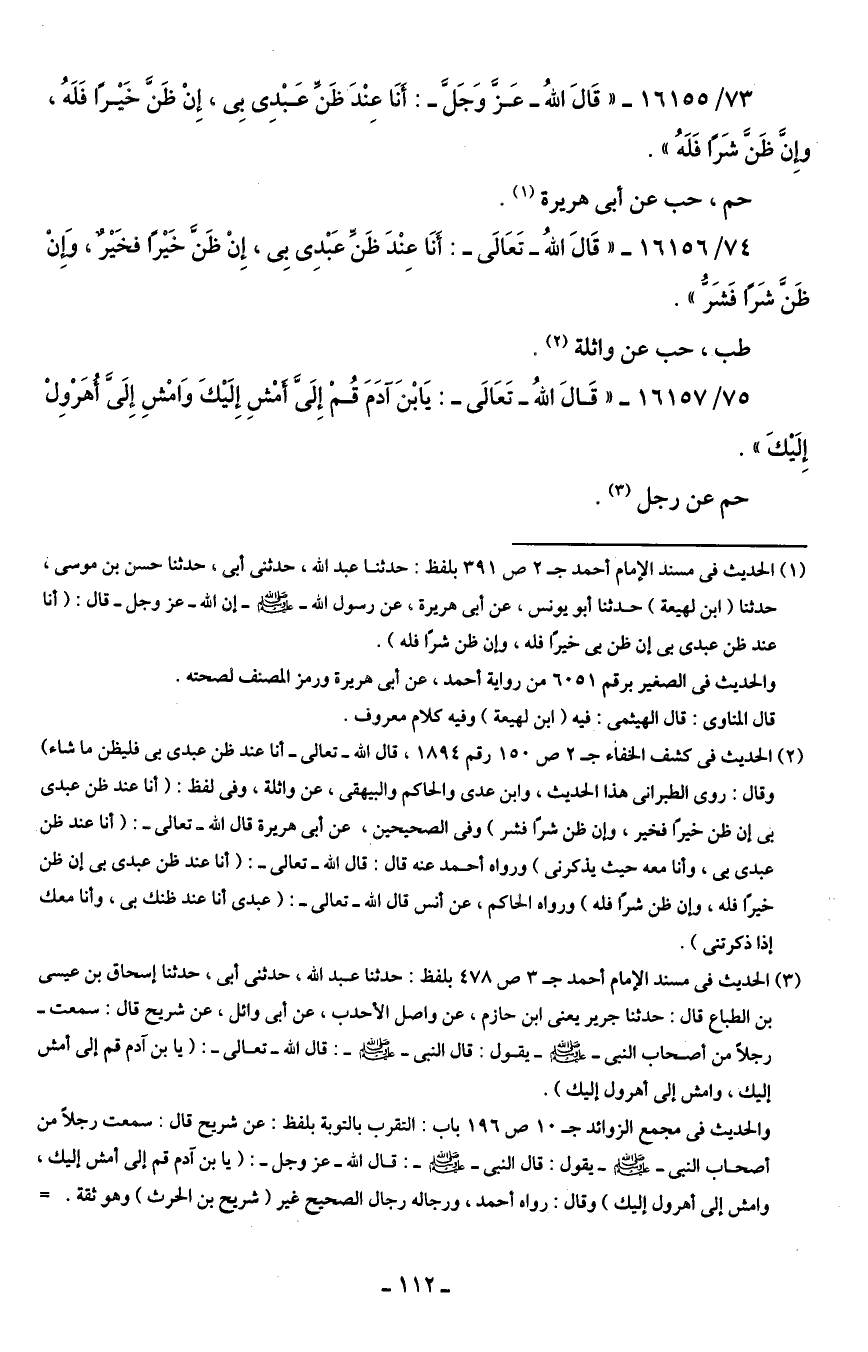(¬3) الحديث في مسند الإمام أحمد جـ 3 ص 478 بلفظ: حدثنا عبد الله، حدثني أبي، حدثنا إسحاق بن عيسى بن الطباع قال: حدثنا جرير يعني ابن حازم، عن واصل الأحدب، عن أبي وائل، عن شريح قال: سمعت- رجلًا من أصحاب النبي - صلى الله عليه وسلم - يقول: قال النبي - صلى الله عليه وسلم -: قال الله -تعالى-: (يا بن آدم قم إلي أمش إليك، وامش إلي أهرول إليك).