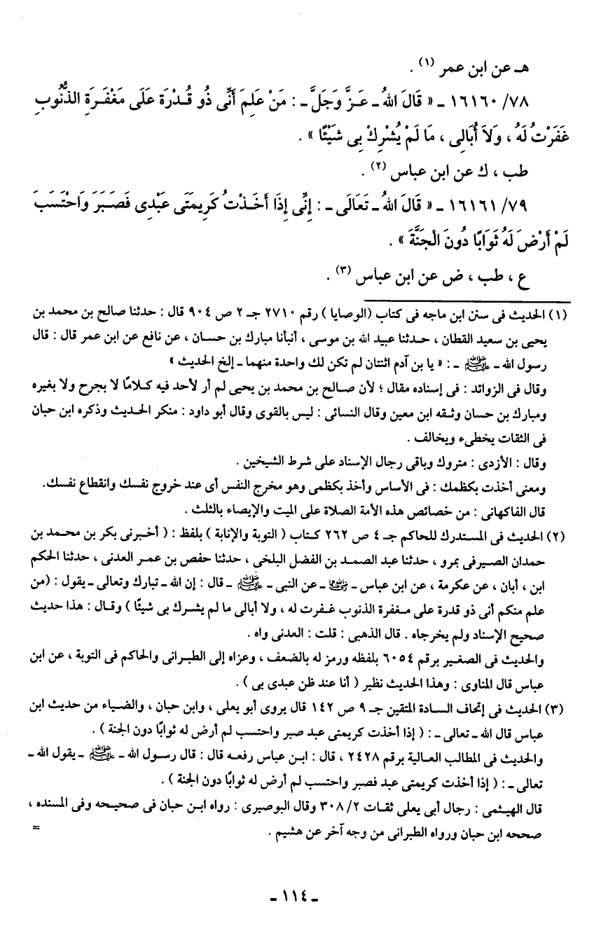 (¬2) الحديث في المستدرك للحاكم جـ 4 ص 262 كتاب (التوبة والإنابة) بلفظ: (أخبرني بكر بن محمد بن حمدان الصيرفي بمرو، حدثنا عبد الصمد بن الفضل البلخي، حدثنا حفص بن عمر العدني، حدثنا الحكم ابن، أبان، عن عكرمة، عن ابن عباس - رضي الله عنهما - عن النبي - صلى الله عليه وسلم - قال: إن الله -تبارك وتعالى- يقول: (من علم منكم أني ذو قدرة علي مغفرة الذنوب غفرت له، ولا أبالي ما لم يشرك بي شيئًا) وقال: هذا حديث صحيح الإسناد ولم يخرجاه. قال الذهبي: قلت: العدني واه.