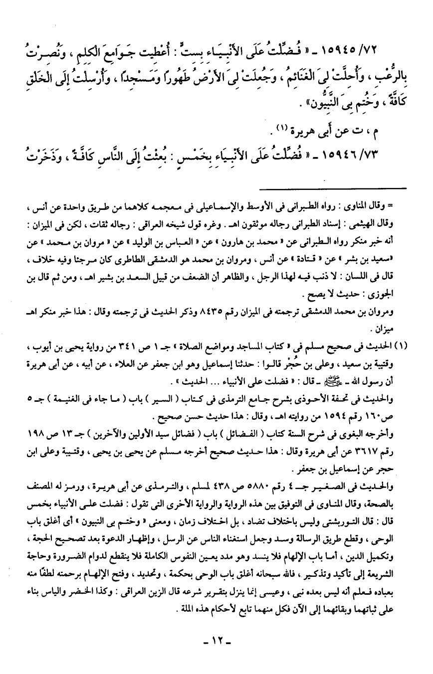 72/ 15945 - "فُضِّلْتُ عَلَى الأْنبِيَاءِ بِسِتٍّ: أُعْطِيت جَوَامِعَ الْكلِمِ وَنُصِرْتُ بِالرُّعْبِ، وَأُحِلَّتْ لِيَ الغَنَائِمُ، وَجُعِلَتْ لِيَ الأَرْضُ طَهُورًا وَمَسْجِدًا، وَأرْسِلتُ إِلَى الْخَلْقِ كَافَةً، وَخُتِم بِى النَّبِيُّون".