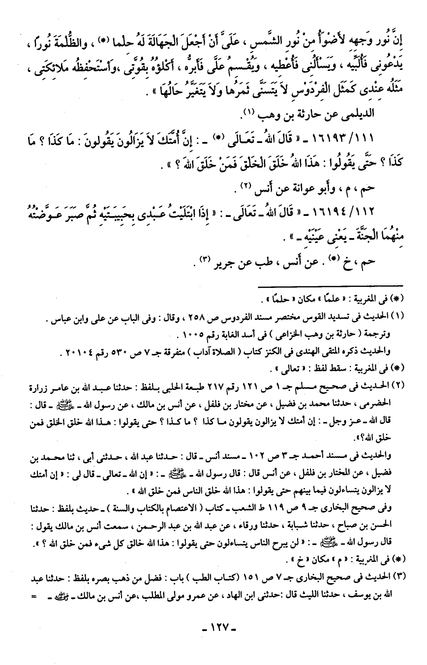 (¬2) الحديث في صحيح مسلم جـ 1 ص 121 رقم 217 طبعة الحلبي بلفظ: حدثنا عبد الله بن عامر زرارة الحضرمي، حدثنا محمد بن فضيل، عن مخنار بن فلفل، عن أنس بن مالك، عن رسول الله - صلى الله عليه وسلم - قال: قال الله -عزَّ وجلَّ-: إن أمتك لا يزالون يقولون ما كذا؟ ما كذا؟ حتى يقولوا: هذا الله خلق الخلق فمن خلق الله؟ ".