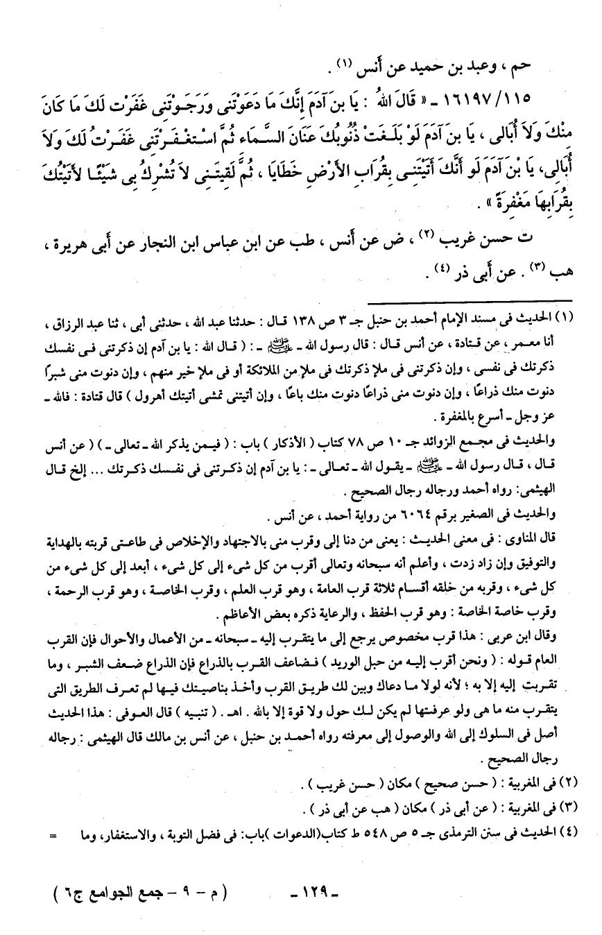 (¬1) الحديث في مسند الإمام أحمد بن حنبل جـ 3 ص 138 قال: حدثنا عبد الله، حدثني أبي، ثنا عبد الرزاق، أنا معمر، عن قتادة، عن أنس قال: قال رسول الله - صلى الله عليه وسلم -: (قال الله: يا بن آدم إن ذكرتني في نفسك ذكرتك في نفسي، وإن ذكرتني في ملإ ذكرتك في ملإ من الملائكة أو في ملإ خير منهم، وإن دنوت مني شبرًا دنوت منك ذراعًا، وإن دنوت مني ذراعًا دنوت منك باعًا، وإن أتيتني تمشي أتيتك أهرول) قال قتادة: فالله -عزَّ وجلَّ- أسرع بالمغفرة.