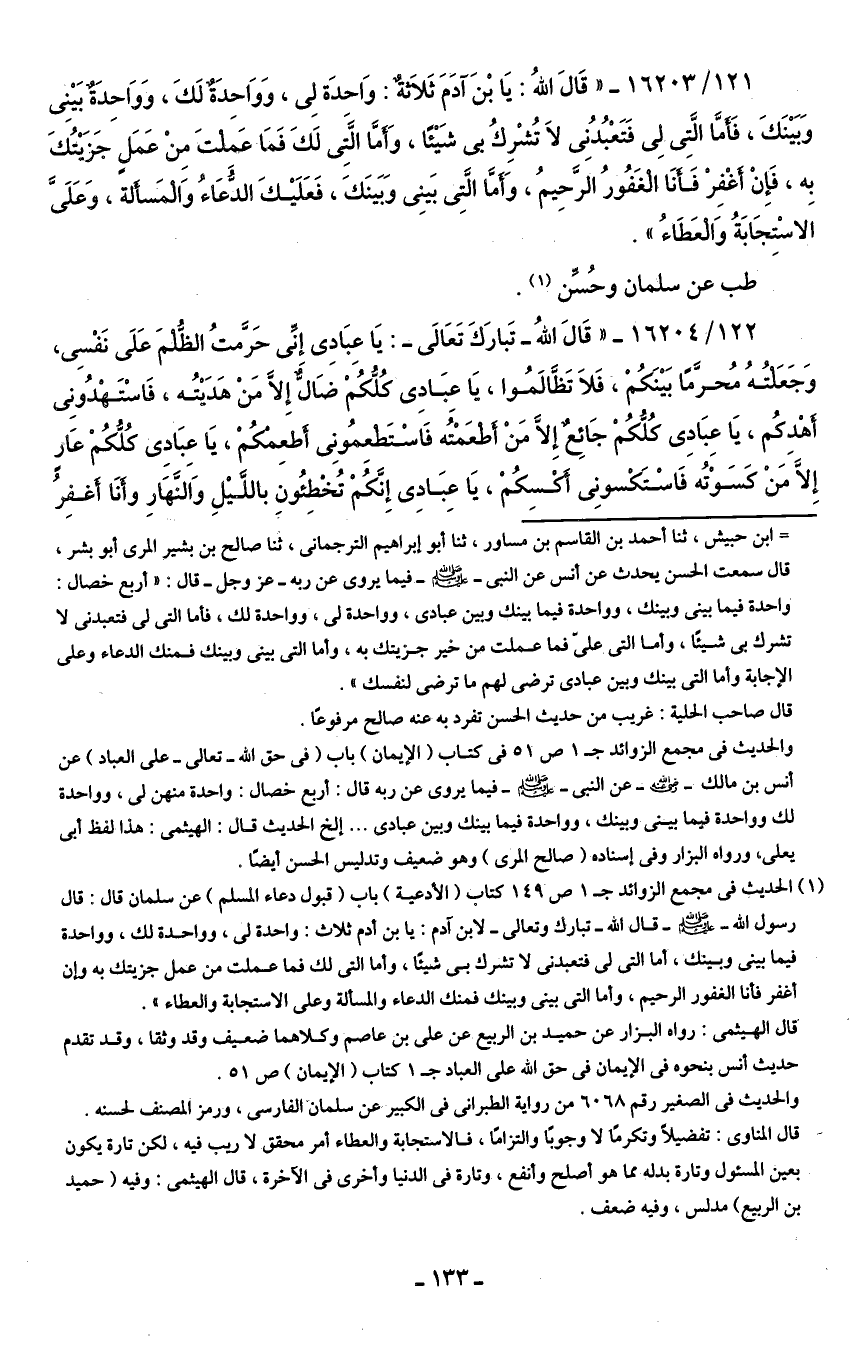 122/ 16204 - "قَال اللهُ -تَبارَكَ وتَعَالى-: يَا عِبَادِي إنِّي حَرَّمتُ الظُّلمَ عَلَي نَفْسِي، وَجَعَلتُهُ مُحرَّمًا بَينَكُمْ، فَلَا تَظَّالمُوا، يَا عبَادِي كُلُّكُمْ ضَالٌ إلا مَنْ هَدَيتُه, فاسْتَهْدُونِي أَهْدِكُم، يَا عِبَادِي كُلُّكُمْ جَائِعٌ إلا مَنْ أطعَمْتُه فَاسْتَطعِمونِي أَطعِمكمْ, يَا عِبَادِي كُلُّكُمْ عَارٍ إلا مَنْ كَسَوْتُه فَاسْتَكْسونِي أَكْسِكُمْ، يَا عِبَادِي إِنَّكُمْ تُخطِئُون باللَّيلِ وَالنَّهَارِ وأَنَا أَغفِرُ