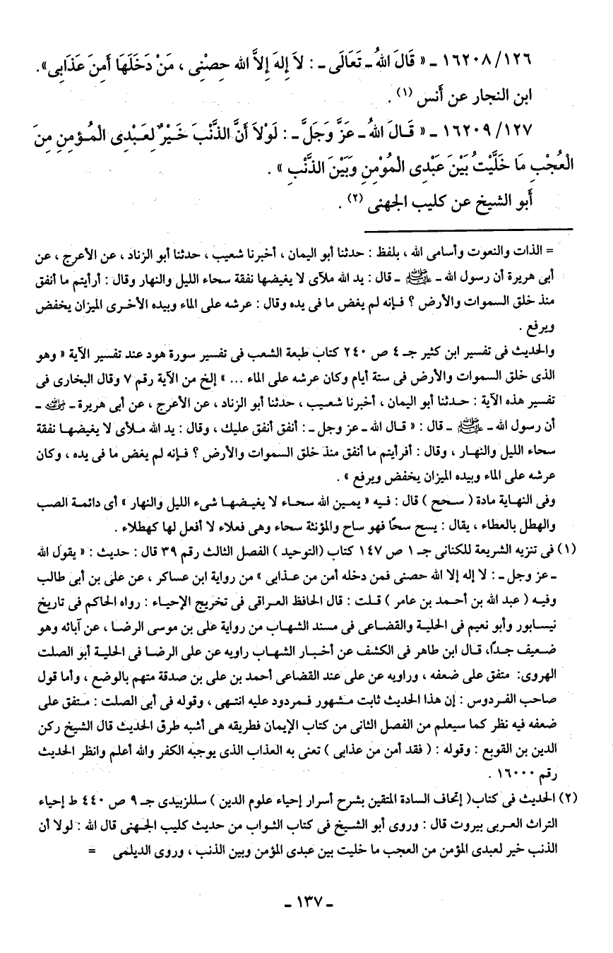 = الذات والنعوت وأسامي الله، بلفظ: حدثنا أبو اليمان، أخبرنا شعيب، حدثنا أبو الزناد، عن الأعرج، عن أبي هريرة أن رسول الله - صلى الله عليه وسلم - قال: يد الله ملآي لا يغيضها نفقة سحاء الليل والنهار وقال: أرأيتم ما أنفق منذ خلق السموات والأرض؟ فإنه لم يغض ما في يده وقال: عرشه علي الماء وبيده الأخرى الميزان يخفض ويرفع.
