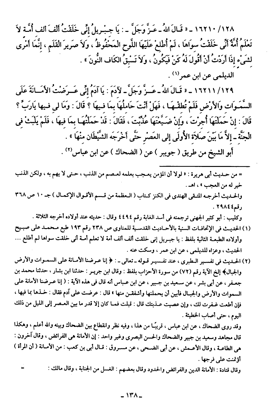 (¬2) الحديث في تفسير الطبري، عند تفسير قوله -تعالى-: {إنا عرضنا الأمانة علي السموات والأرض والجبال} إلخ الآية رقم (72) من سورة الأحزاب بلفظ: وقال ابن جرير: حدثنا ابن بشار، حدثنا محمد بن جعفر، عن أبي بشر، عن سعيد بن جبير، عن ابن عباس أنه قال في هذه الآية: {إنا عرضنا الأمانة علي السموات والأرض والجبال فأبين أن يحملنها وأشفقن منها" قال: عرضت علي آدم فقال: خذها بما فيها، فإن أطعت غفرت لك، وإن عصيت عذبتك قال: قبلت فما كان إلا قدر ما بين العصر إلي الليل من ذلك اليوم، حتى أصاب الخطيئة.