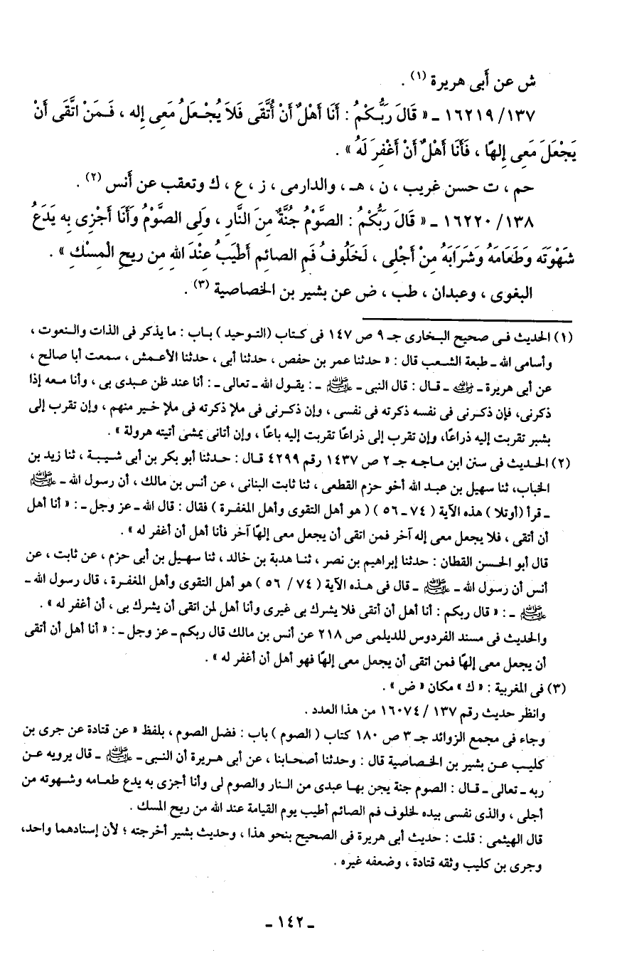 (¬2) الحديث في سنن ابن ماجه جـ 2 ص 1437 رقم 4299 قال: حدثنا أبو بكر بن أبي شيبة، نا زيد بن الخباب، ثنا سهيل بن محبد الله أخو حزم القطعى، ثنا ثابت البنانى، عن أنس بن مالك، أن رسول الله - صلى الله عليه وسلم - قرأ (أو تلا) هذه الآية (74 - 56) (هو أهل التقوى وأهل المغفرة) فقال: قال الله-عزَّ وجلَّ-: "أنا أهل أن أتقى، فلا يجعل معى إله آخر فمن اتقى أن يجعل معى إلها آخر فأنا أهل أن أغفر له".