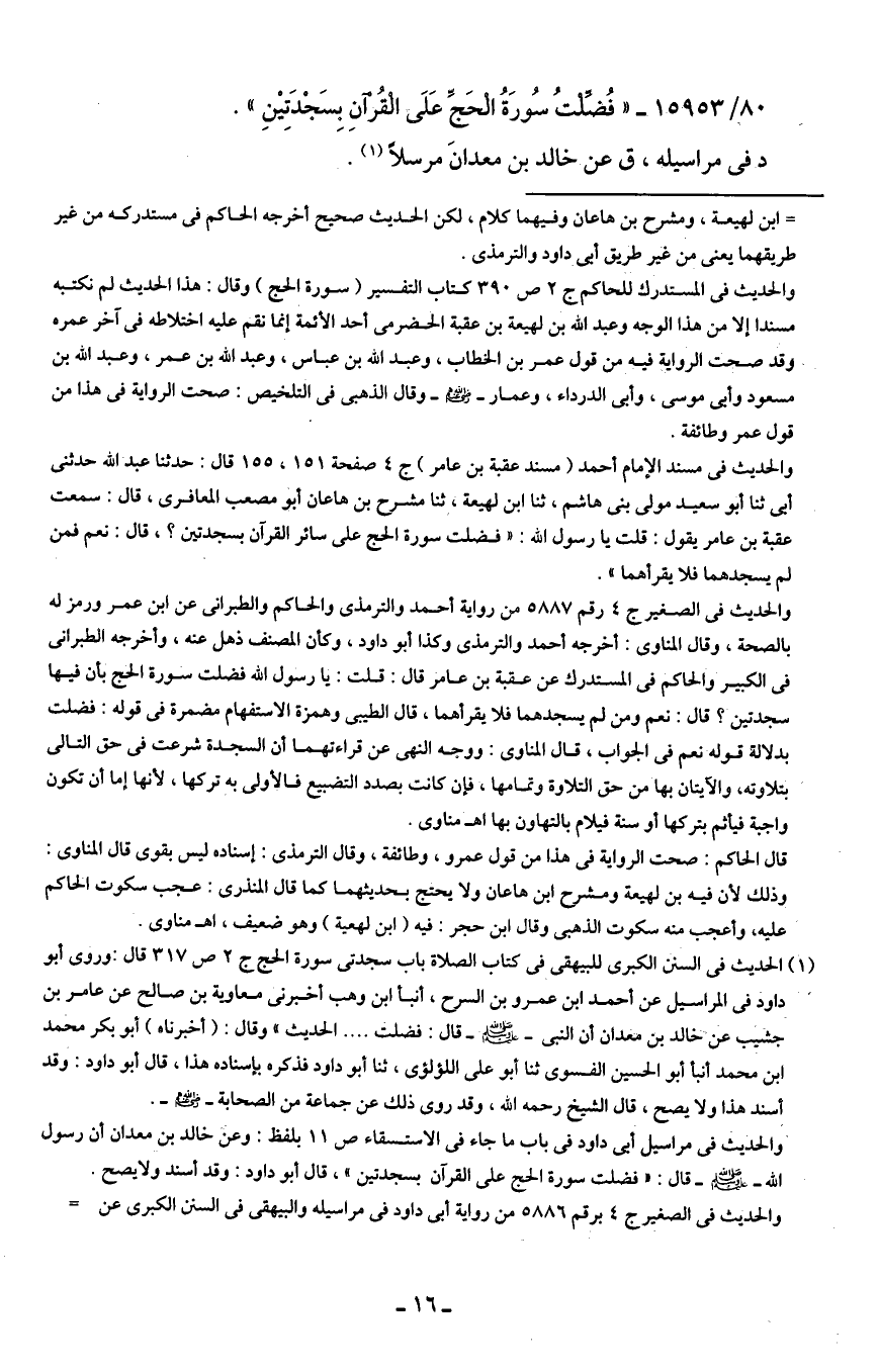 80/ 15953 - "فُضِّلْتُ سُورَةُ الْحَجِّ عَلَى الْقُرآنِ بِسَجْدَتِينِ".