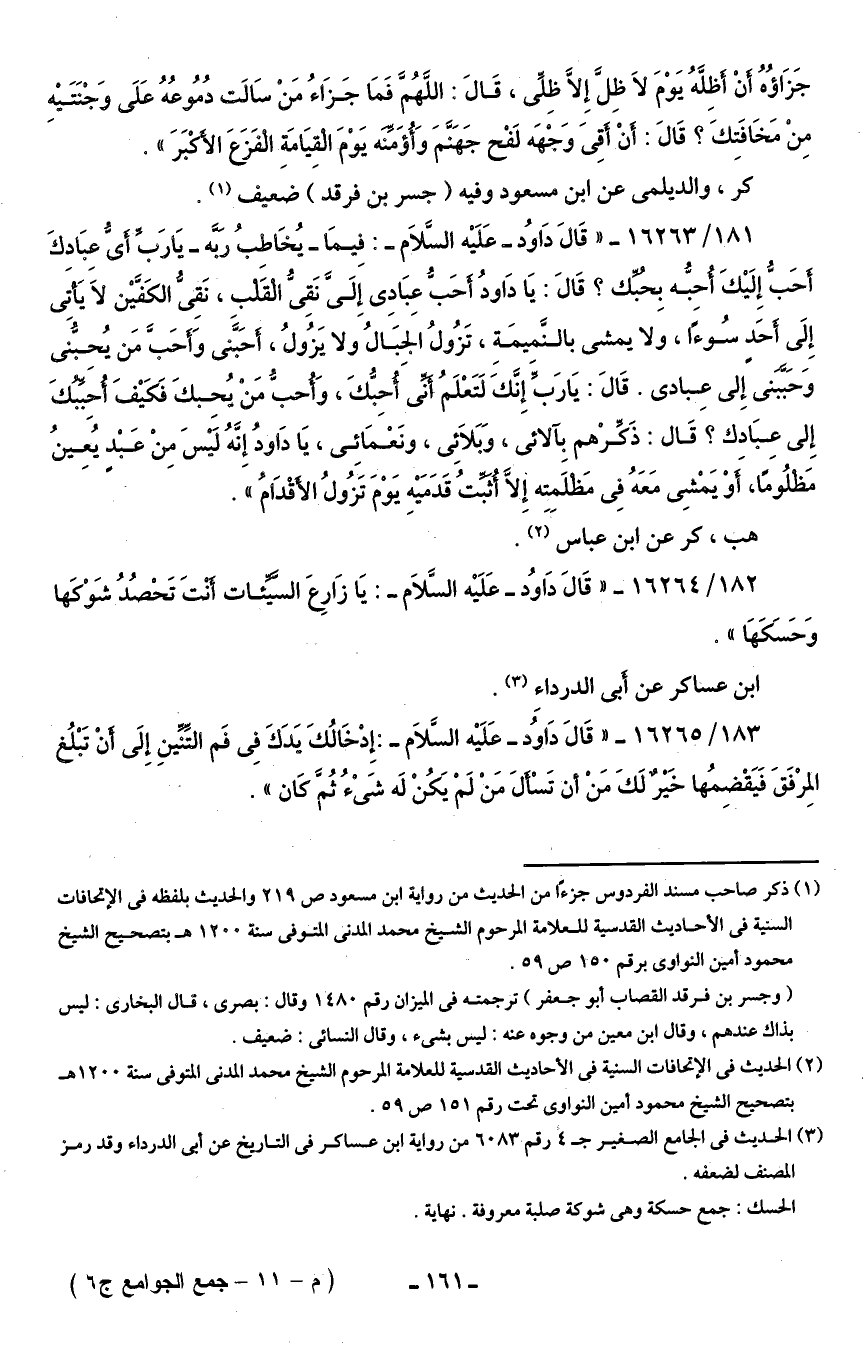 (¬1) ذكر صاحب مسند الفردوس جزءًا من الحديث من رواية ابن مسعود ص 219 والحديث بلفظه في الإتحافات السنية في الأحاديث القدسية للعلامة المرحوم الشيخ محمَّد المدني المتوفى سنة 1200 هـ بتصحيح الشيخ محمود أمن النواوى برقم 150 ص 59.