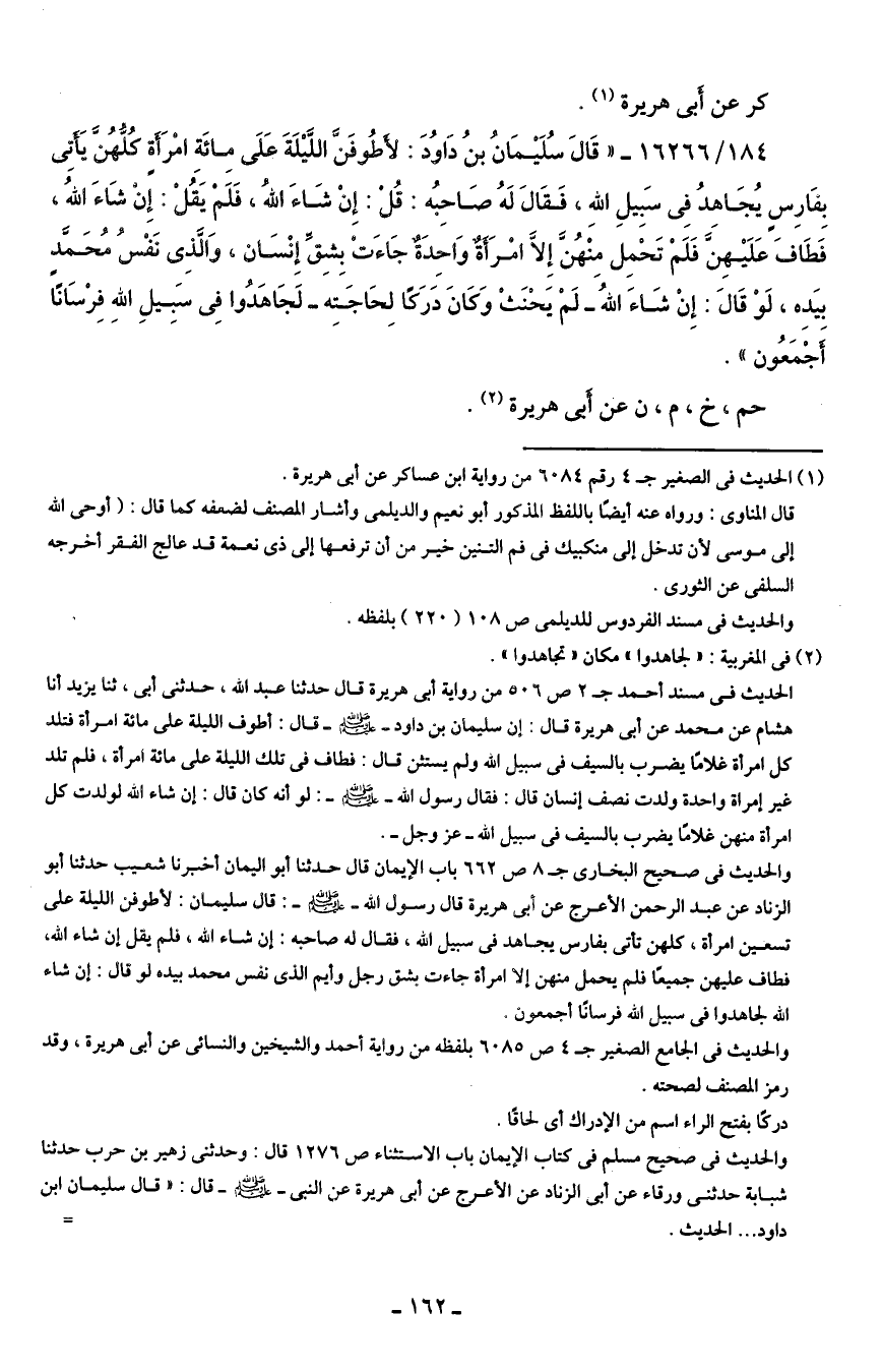 184/ 16266 - "قَال سُلَيمَانُ بن دَاود: لأطُوفن الليلَة عَلَى مائة امرأةٍ كلهن يَأتي بِفَارِس يُجَاهِدُ في سَبِيلِ اللهِ، فَقَال لَهُ صَاحِبه: قل: إِن شَاءَ الله"، فلَمْ يَقل: إن شاءَ الله, فطَاف عَلَيهِن فَلَمْ تَحْمِل منْهنَّ إلا امرَأةٌ وَاحِدَةٌ جَاءَت بِشِقِّ إِنْسَان, والذي نفس محمدٍ بيَدِه، لَوْ قَال: إِنْ شَاءَ الله -لَمْ يَحْنَثْ وَكَانَ دَرَكًا لِحَاجَتِه- لَجَاهَدوا في سَبِيلِ اللهِ فِرْسَانًا أَجْمَعُون".