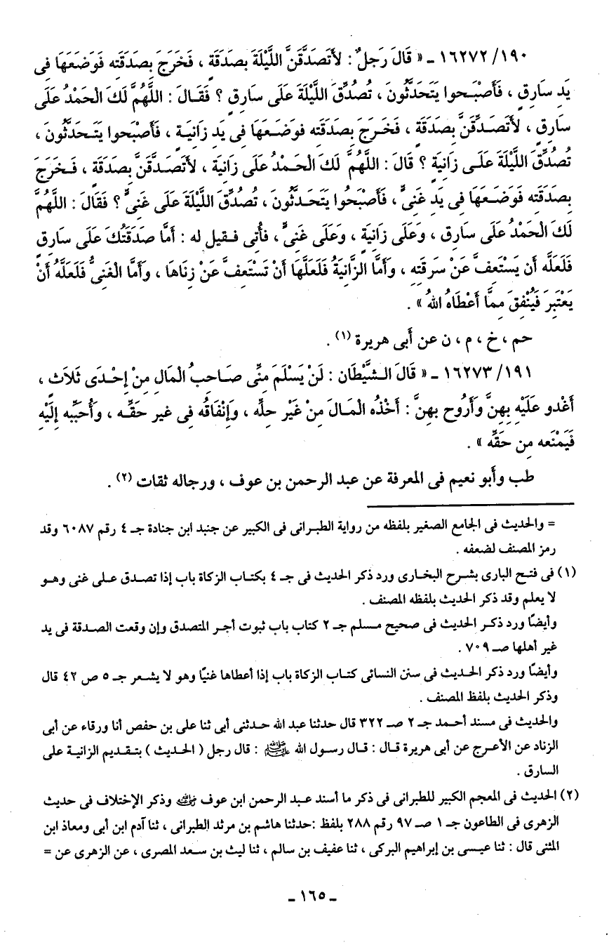 190/ 16272 - "قَال رجلٌ لأتَصَدقنَّ اللَّيلَةَ بصَدَقَة، فخرجَ بصَدَقَتِه فوَضعَها في يَدِ سَارِق، فَأصبَحوا يَتَحَدثونَ، تُصُدِّقَ الليلَةَ على سَارِقٍ؟ فقَال اللهُمَّ لَكَ الْحَمْدُ عَلَى سَارِقٍ، لَأتَصَدَّقَنَّ بصَدَقَةٍ، فَخَرج بصَدقَتِه فوَضعَهَا في يَدِ زانيَةٍ، فأصْبَحوا يَتَحَدثون, تُصُدِّقَ الليلَةَ عَلَى زانِيَةٍ؟ قَال: اللهُمَّ لَكَ الْحَمْدُ عَلَى زَانِيَة، لَأتَصدقَنَّ بصَدَقَة، فَخَرج بِصَدَقَته فَوَضَعَها في يَدِ غَنِيٍّ، فَأصبَحُوا يَتَحَدثونَ، تصُدّقَ الليلَةَ عَلَى غنِيٍّ؟ فقَال: اللَهم لَكَ الحمْدُ على سَارِقٍ وعلى زانيَةٍ, وَعَلَى غَنِيٍّ، فأُتِي فقيل له: أمَّا صَدَقَتكَ على سَارِقٍ فَلَعَله أن يَسْتَعف عَنْ سَرقَتِهِ، وَأمَّا الزانيَةُ فَلَعَلَّهَا أن تسْتعِفَّ عن زناها، وَأمَّا الغنيُّ فَلعَلهُ أن يَعْتَبِرَ فَيُنْفِقَ مِما أعْطَاهُ اللهُ".