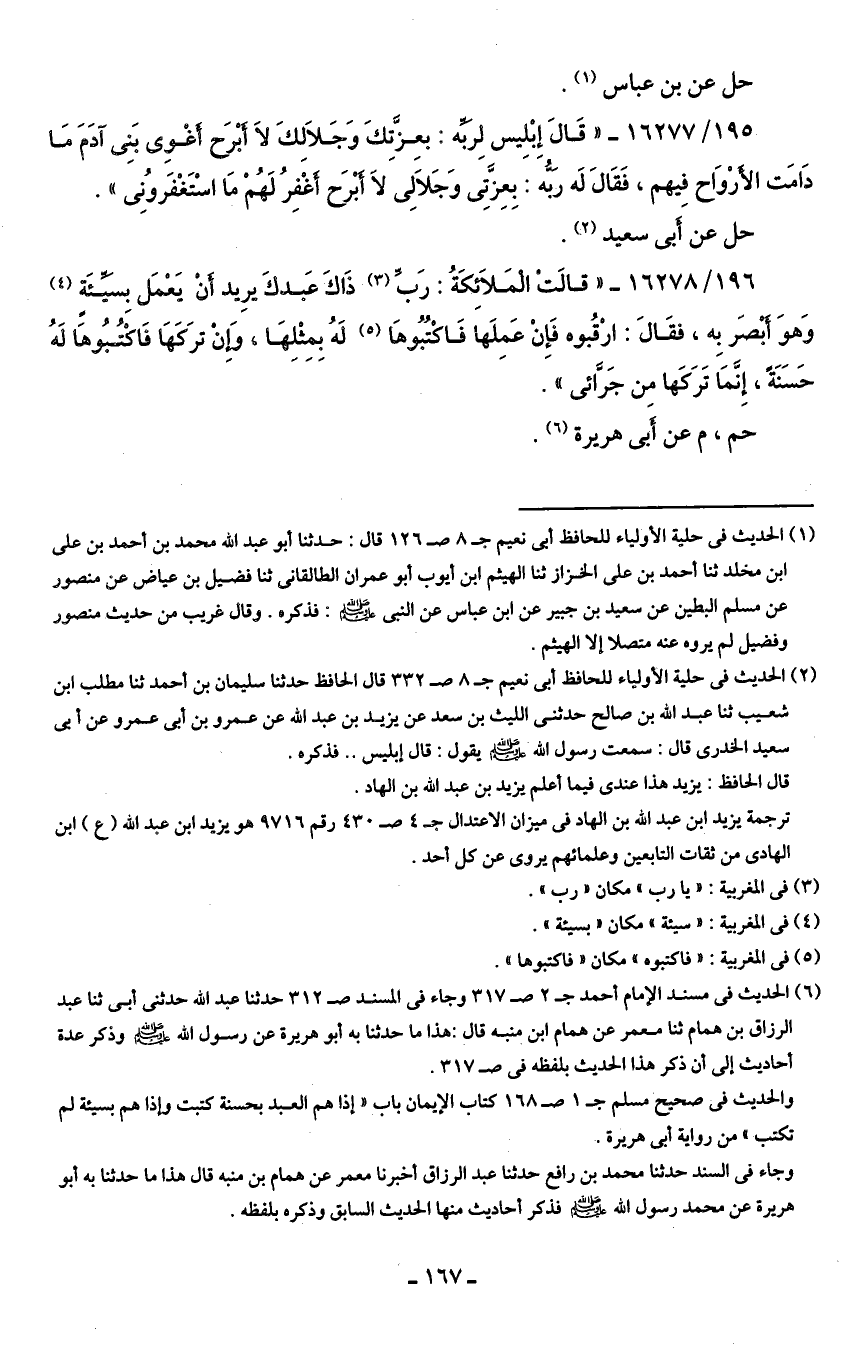 195/ 16277 - "قَال إِبْليس لربه: بعِزتكَ وَجَلالِكَ لَا أبْرح أغوي بني آدم ما دَامَت الأرْوَاح فيهم، فَقَال لَه ربُّه: بِعِزتى وَجَلالِى لَا أبرحَ أغْفرُ لَهُمْ مَا اسْتَغْفَروُنِي".