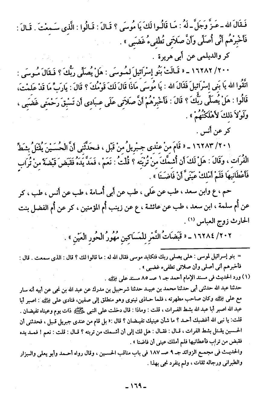 201/ 16283 - "قامَ مِنْ عِنْدِي جِبْرِيلُ مِنْ قبْل، فحَدثنِي أن الحُسَينَ يُقْتَل بشَطِّ الفُرَاتِ، وَقَال: هَلْ لَكَ أن أُشِمَّكَ مِنْ تُرْبَتِه؟ قُلتُ: نعَمْ, فمَدَّ يَدَهُ فقَبَضَ قبْضَةً مِن تُرَابٍ فَأعْطَانِيهَا فَلَمْ أمْلِك عَينَيَّ أنْ فَاضَتَا".