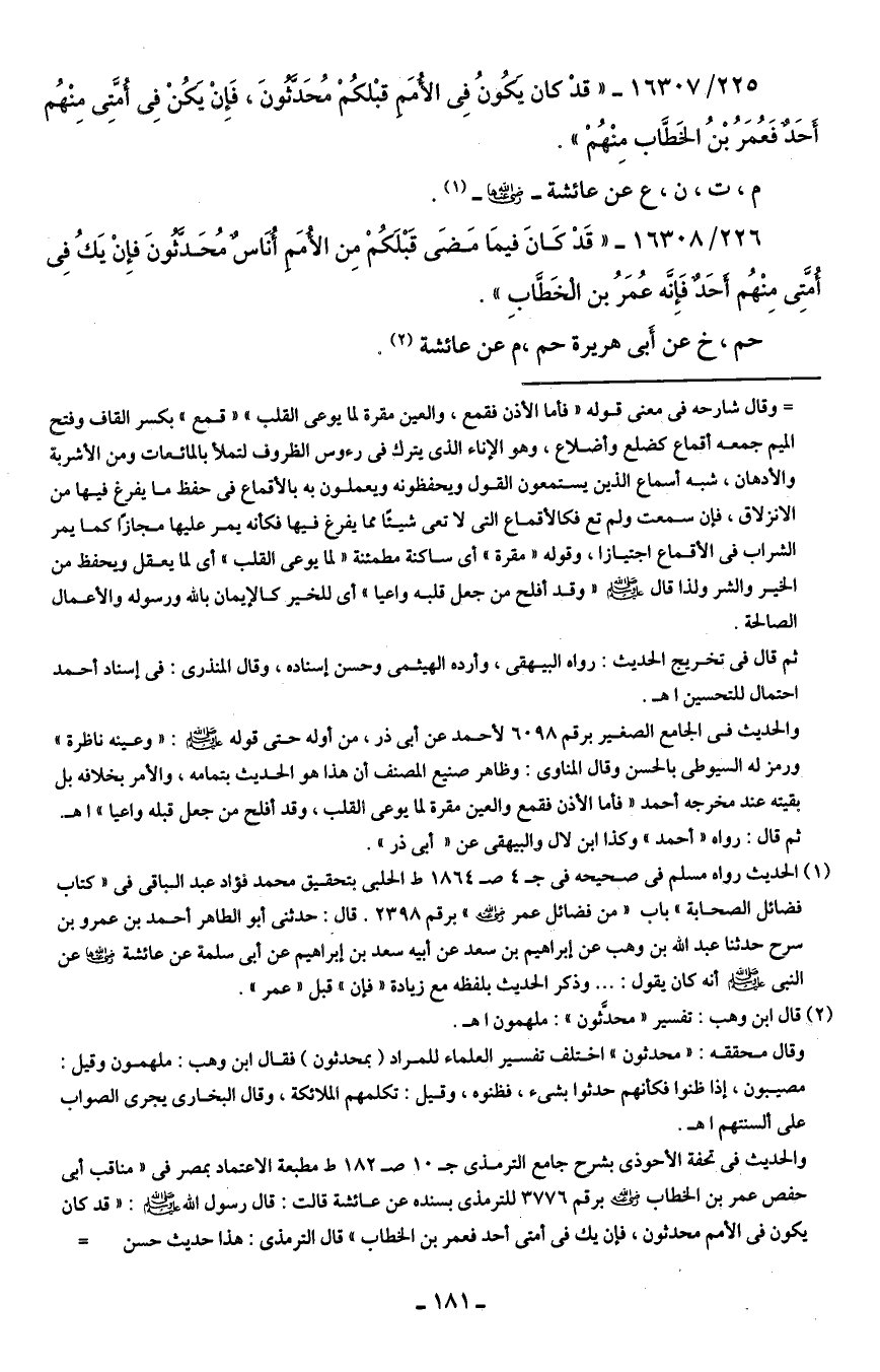 225/ 16307 - "قدْ كان يَكُونُ فِي الأُمَمِ قَبْلكُمْ مُحَدِّثُونَ، فَإِنْ يَكُنْ فِي أُمَّتِي مِنْهُم أحَدٌ فَعُمَرُ بْنُ الخَطَّاب مِنْهُم".