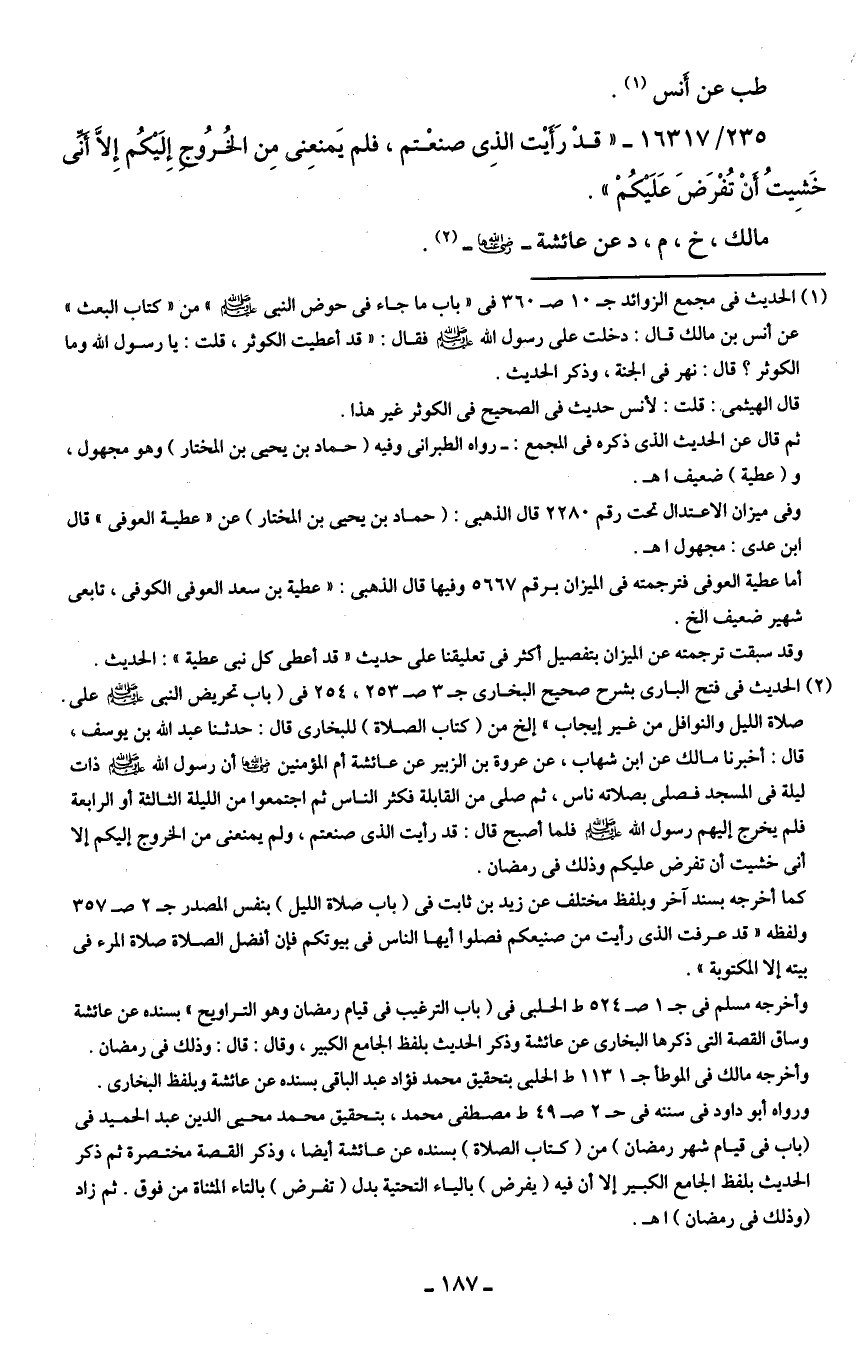 (¬2) الحديث في فتح الباري بشرح صحيح البخاري ج 3 ص 253، 254 في (باب تحريض النبي - صلى الله عليه وسلم - علي صلاة الليل والنوافل من غير إيجاب، إلخ من (كتاب الصلاة) للبخارى قال: حدثنا عبد الله بن يوسف، قال: أخبرنا مالك عن ابن شهاب، عن عروة بن الزبير عن عائشة أم المؤمنين - رضي الله عنها - أن رسول الله - صلى الله عليه وسلم - ذات ليلة في المسجد فصلى بصلاته ناس، ثم صلى من القابلة فكثر الناس ثم اجتمعوا من الليلة الثالثة أو الرابعة فلم يخرج إليهم رسول الله - صلى الله عليه وسلم - فلما أصبح قال: قد رأيت الذي صنعتم، ولم يمنعنى من الخروج إلي أني خشيت أن تفرض عليكم وذلك في رمضان.