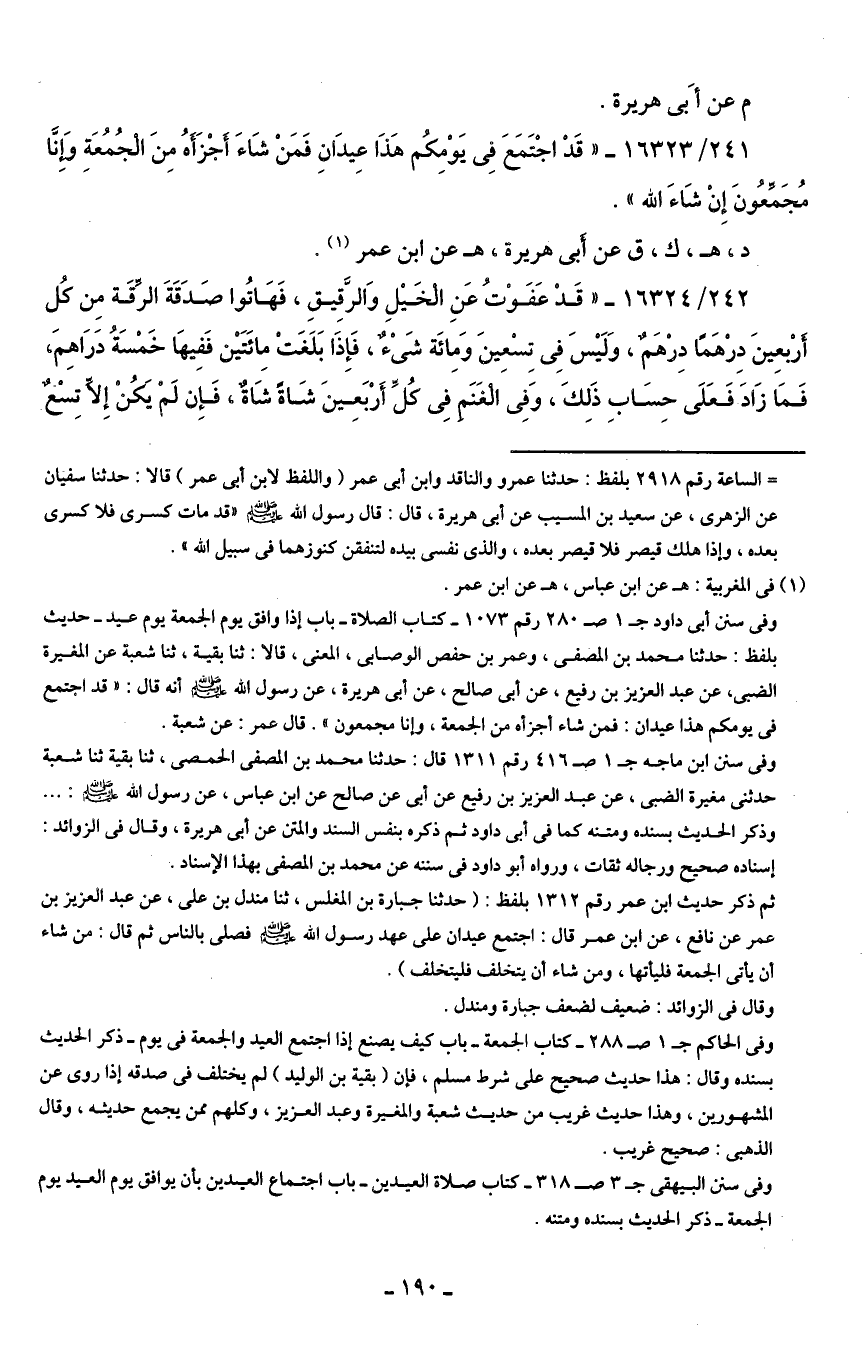 ثم ذكر حديث ابن عمر رقم بلفظ: (حدثنا جبارة بن المغلس، ثنا مندل بن علي، عن عبد العزيز بن عمر عن نافع، عن ابن عمر قال: اجتمع عيدان على عهد رسول الله - صلى الله عليه وسلم - فصلى بالناس ثم قال: من شاء أن يأتي الجمعة فليأتها، ومن شاء أن يتخلف فليتخلف).