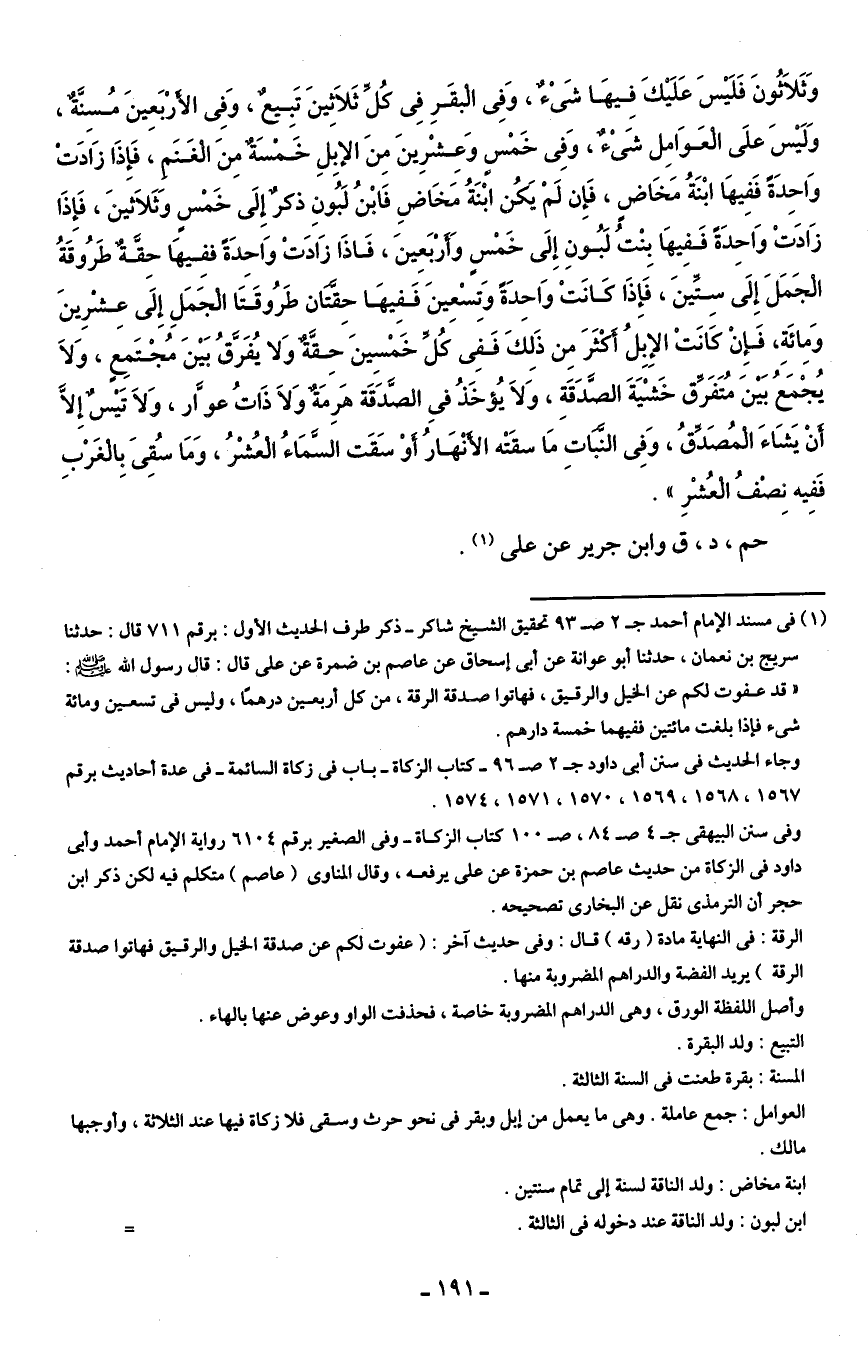 (¬1) في مسند الإمام أحمد ج 2 ص 93 تحقيق الشيخ شاكر- ذكر طرف الحديث الأول: برقم 711 قال: حدثنا سريج بن نعمان، حدثنا أبو عوانة عن أبي إسحاق عن عاصم بن ضمرة عن علي قال: قال رسول الله - صلى الله عليه وسلم -: "قد عفوت لكم عن الخيل والرقيق، فهاتوا صدقة الرقة، من كل أربعين درهمًا، وليس في تسعين ومائة شيء فإذا بلغت مائتين ففيهما خمسة دارهم.