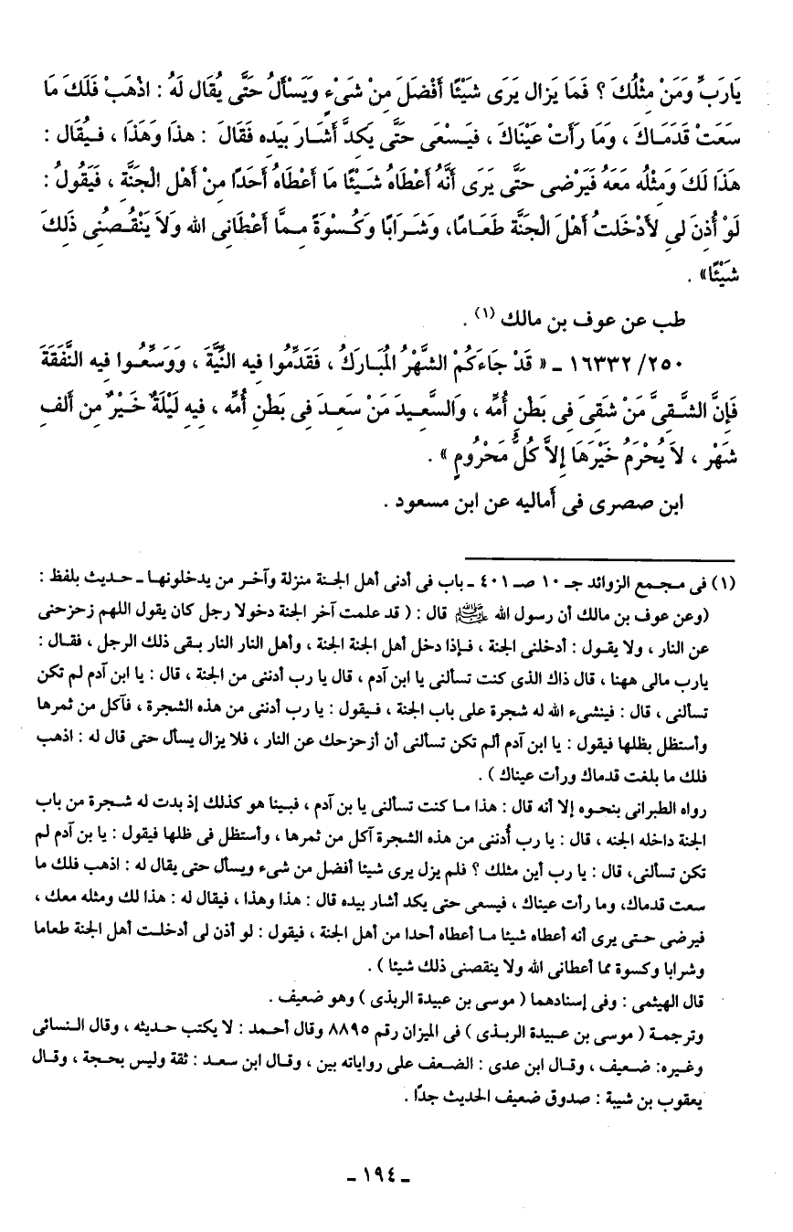 (¬1) في مجمع الزوائد ج 10 ص 401 - باب في أدنى أهل الجنة منزلة وآخر من يدخلونها - حديث بلفظ: وعن عوف بن مالك أن رسول الله - صلى الله عليه وسلم - قال: "قد علمت آخر الجنة دخولا رجل كان يقول اللهم زحزحنى عن النار، ولا يقول: أدخلنى الجنة، فإذا دخل أهل الجنة الجنة، وأهل النار النار بقى ذلك الرجل، فقال: يا رب ما لي ها هنا، قال ذاك الذي كنت تسألني يا ابن آدم، قال يا رب أُدنني من الجنة، قال: يا ابن آدم لم تكن تسألنى، قال: فينشئ الله له شجرة على باب الجنة، فيقول: يا رب أدننى من هذه الشجرة، فآكل من ثمرها وأستظل بظلها فيقول: يا ابن آدم ألم تكن تسألنى أن أزحزحك عن النار، فلا يزال يسأل حتى قال له: اذهب فلك ما بلغت قدماك ورأت عيناك).