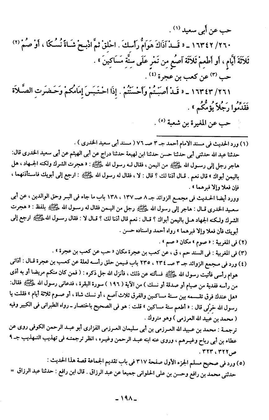 (¬4) وارد في مجمع الزوائد ج 3 ص 234، 235 باب فيمن حلق رأسه لعلة عن كعب بن عجرة قال: أذاني هوام رأسى فأتيت رسول الله - صلى الله عليه وسلم - فسألته عن ذلك، فأنزل الله جل ذكره: {فَمَنْ كَانَ مِنْكُمْ مَرِيضًا أَوْ بِهِ أَذًى مِنْ رَأْسِهِ فَفِدْيَةٌ مِنْ صِيَامٍ أَوْ صَدَقَةٍ أَوْ نُسُكٍ} من الآية (196) سورة البقرة، فدعانى رسول الله - صلى الله عليه وسلم - فقال: "هل عندك فرق تقسمه بين ستة مساكين والفرق ثلاث آصع، أو نسك شاة، أو صوم ثلاثة أيام" فقلت يا رسول الله خرلي قال: "أطعم ستة مساكين" قلت: هو في الصحيح باختصار - رواه الطبراني في الكبير وفيه (محمد بن عبيد الله العرزمى) وهو متروك.