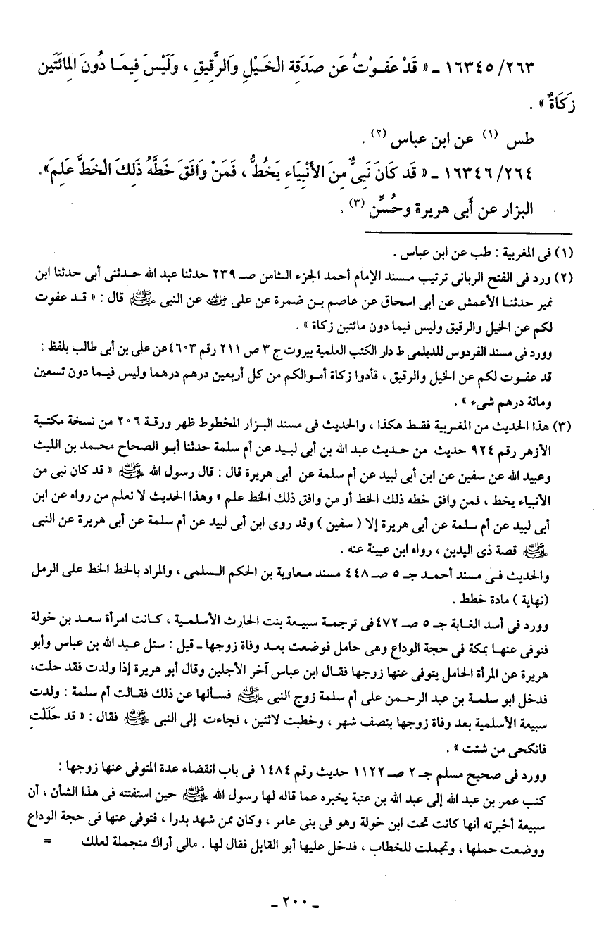 (¬2) ورد في الفتح الرباني ترتيب مسند الإمام أحمد الجزء الثامن ص 239 حدثنا عبد الله حدثني أبي حدثنا ابن نمير حدثنا الأعمش عن أبي إسحاق عن عاصم بن ضمرة عن على - رضي الله عنه - عن النبي قال: "قد عفوت لكم عن الخيل والرقيق وليس فيما دون مائتين زكاة".
