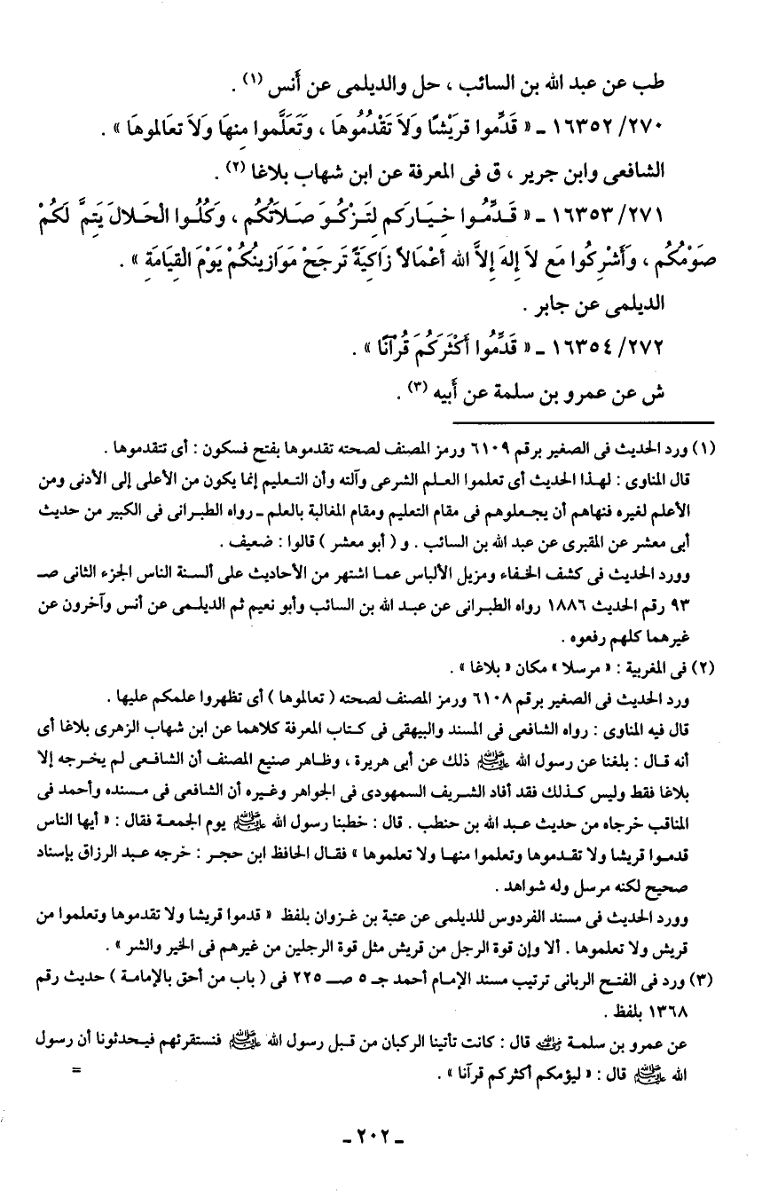 270/ 16352 - "قَدِّموا قرَيشًا وَلَا تَقْدُمُوهَا، وَتَعَلَّموا مِنهَا وَلَا تعَالموهَا".