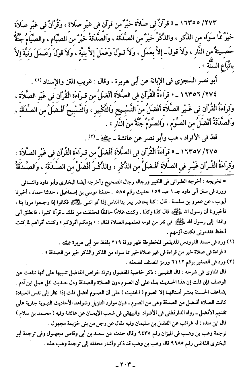 275/ 16357 - "قِرَاءَةُ القُرْآنِ فِي الصَّلاةِ أَفْضَلُ مِن قِرَاءَةِ الْقُرْآنِ فِي غَيرِ الصَّلاةِ، وَقِرَاءَةُ الْقُرآنِ غَيرِ في الصَّلاةِ أَفْضَلُ مِنْ الذِّكْرِ، والذِّكْرُ أَفْضلُ مِن الصَّدَقَةِ، وَالصَّدَقَةُ