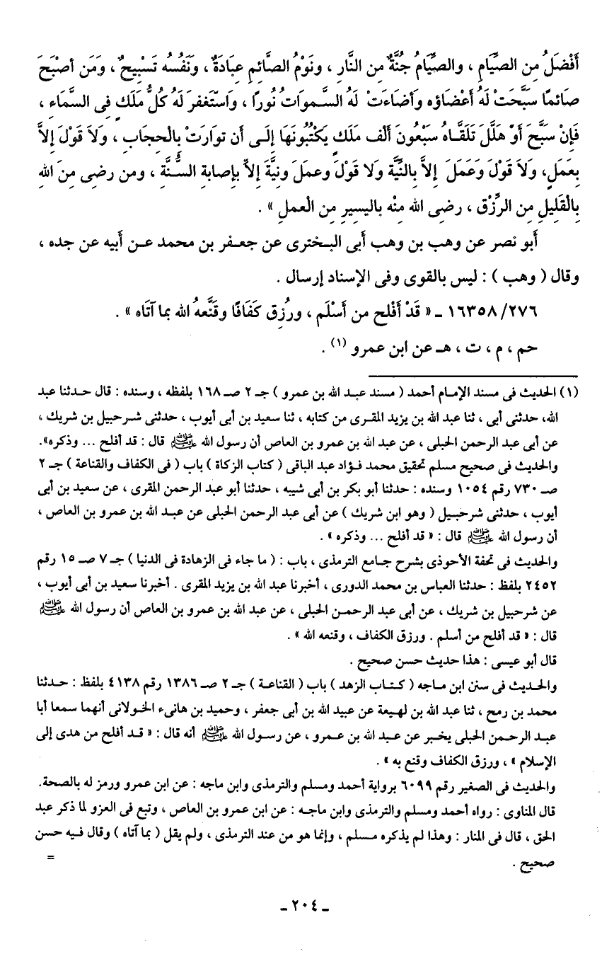 (¬1) الحديث في مسند الإمام أحمد (مسند عد الله بن عمرو) جـ 2 صـ 168 بلفظه، وسنده: قال حدثنا عبد الله، حدثني أبي، ثنا عبد الله بن يزيد المقرى من كتابه، ثنا سعيد بن أبي أيوب، حدثني شرحبيل بن شريك، عن أبي عبد الرحمن الحبلى، عن عبد الله بن عمرو بن العاص أن رسول الله - صلى الله عليه وسلم - قال: قد أفلح ... وذكره".