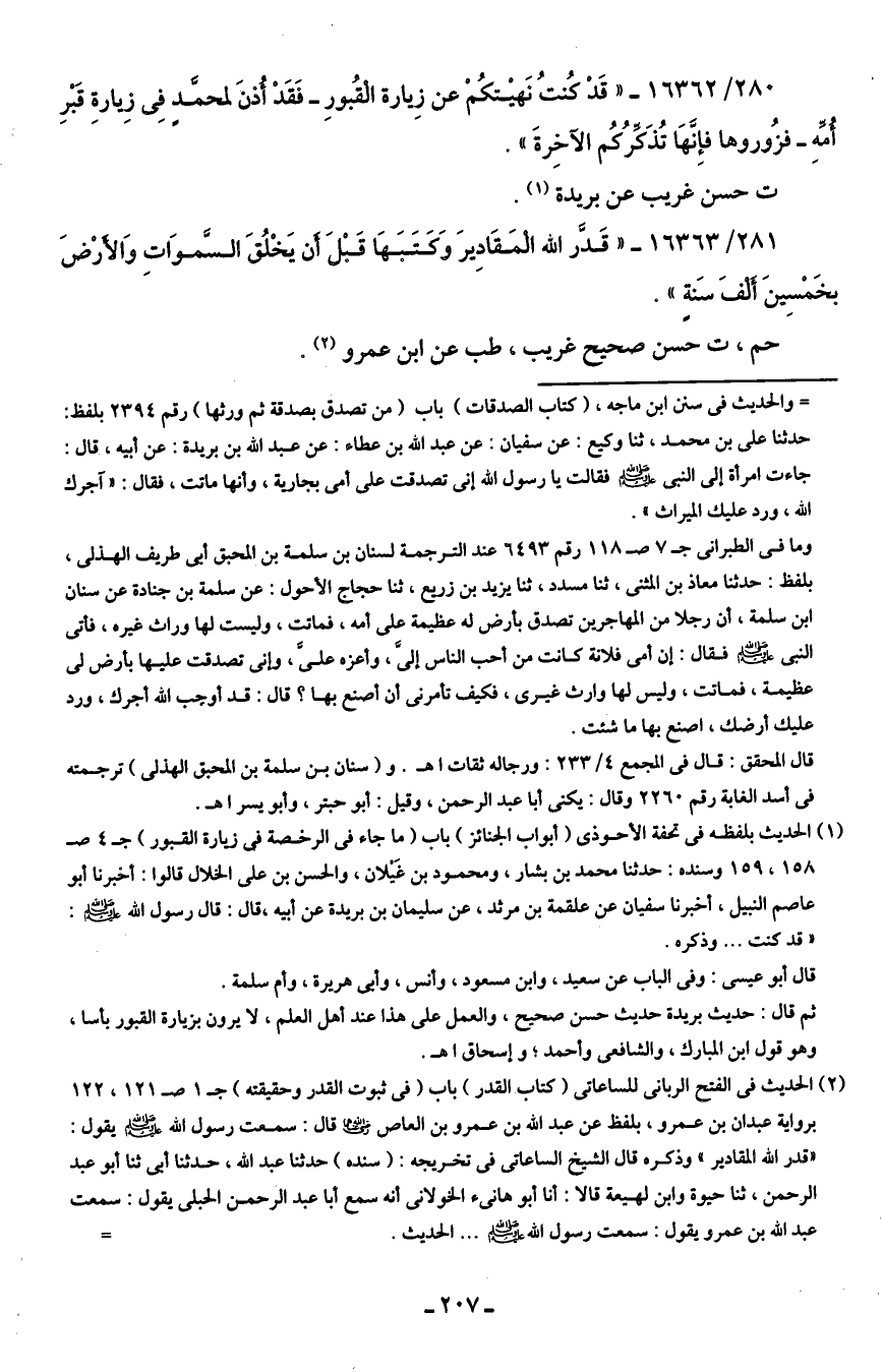 (¬1) الحديث بلفظه في تحفة الأحوذي (أبواب الجنائز) باب (ما جاء في الرخصة في زيارة القبور) جـ 4 صـ 158، 159 وسنده: حدثنا محمد بن بشار، ومحمود بن غَيلان، والحسن بن علي الخلال قالوا: أخبرنا أبو عاصم النبيل، أخبرنا سفيان عن علقمة بن مرثد، عن سليمان بن بريدة عن أبيه، قال: قال رسول الله - صلى الله عليه وسلم -: "قد كنت ... وذكره.