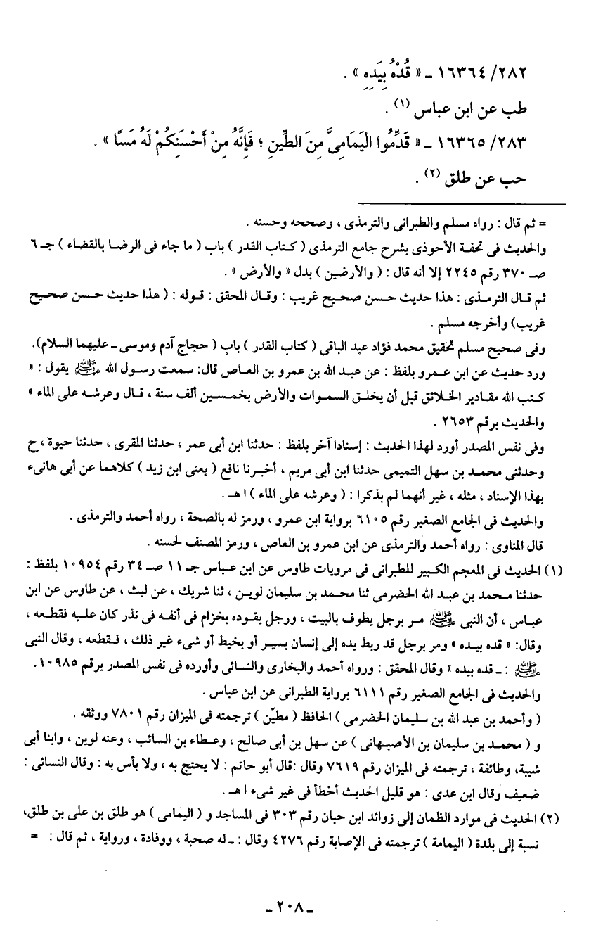 (¬1) الحديث في المعجم الكبير للطبرانى في مرويات طاوس عن ابن عباس جـ 11 صـ رقم 10954 بلفظ: حدثنا محمد بن عبد الله الحضرمى ثنا محمد بن سلمان لوين، ثنا شريك، عن ليث، عن طاوس عن ابن عباس، أن النبي - صلى الله عليه وسلم - مر برجل يطوف بالبيت، ورجل يقوده بخزام في أنفه في نذر كان عليه فقطعه، وقال: "قده بيده" ومر برجل قد ربط يده إلى إنسان بسير أو بخيط أو شيء غير ذلك، فقطعه، وقال النبي - صلى الله عليه وسلم -: - قده بيده" وقال المحقق: ورواه أحمد والبخارى والنسائي وأورده في نفس المصدر برقم 10985.