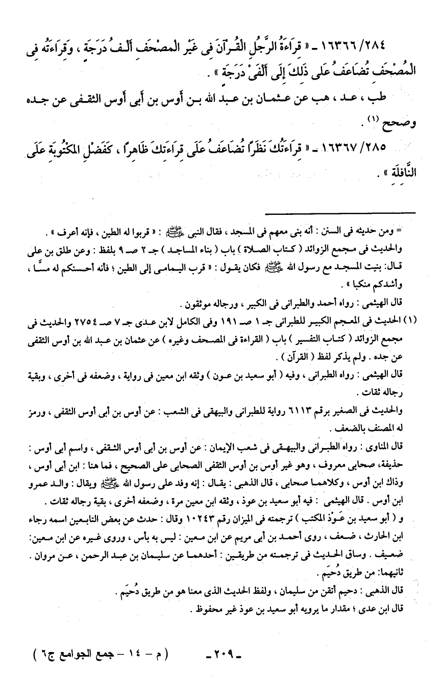 (¬1) الحديث في المعجم الكبير للطبراني جـ 1 صـ 191 وفي الكامل لابن عدي جـ 7 صـ 2754 والحديث في مجمع الزوائد (كتاب التفسير) باب (القراءة في المصحف وغيره) عن عثمان بن عبد الله بن أوس الثقفى عن جده. ولم يذكر لفظ (القرآن).