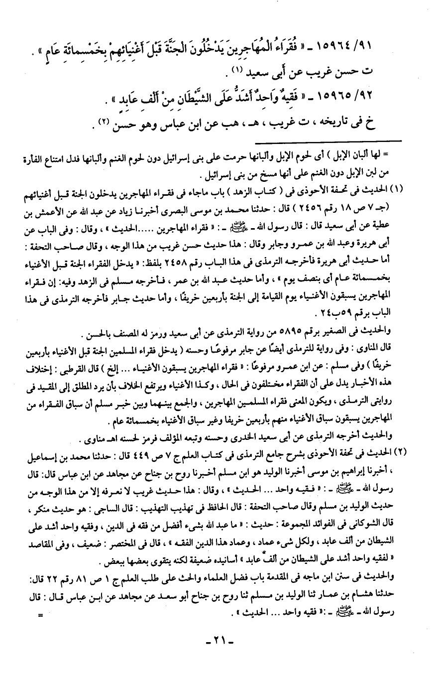 91/ 15964 - "فُقَرَاءُ الْمُهَاجِرِينَ يَدْخلُونَ الْجَنَّةَ قَبْلَ أَغْنيَائِهِمْ بخَمْسمائَة عَامٍ".