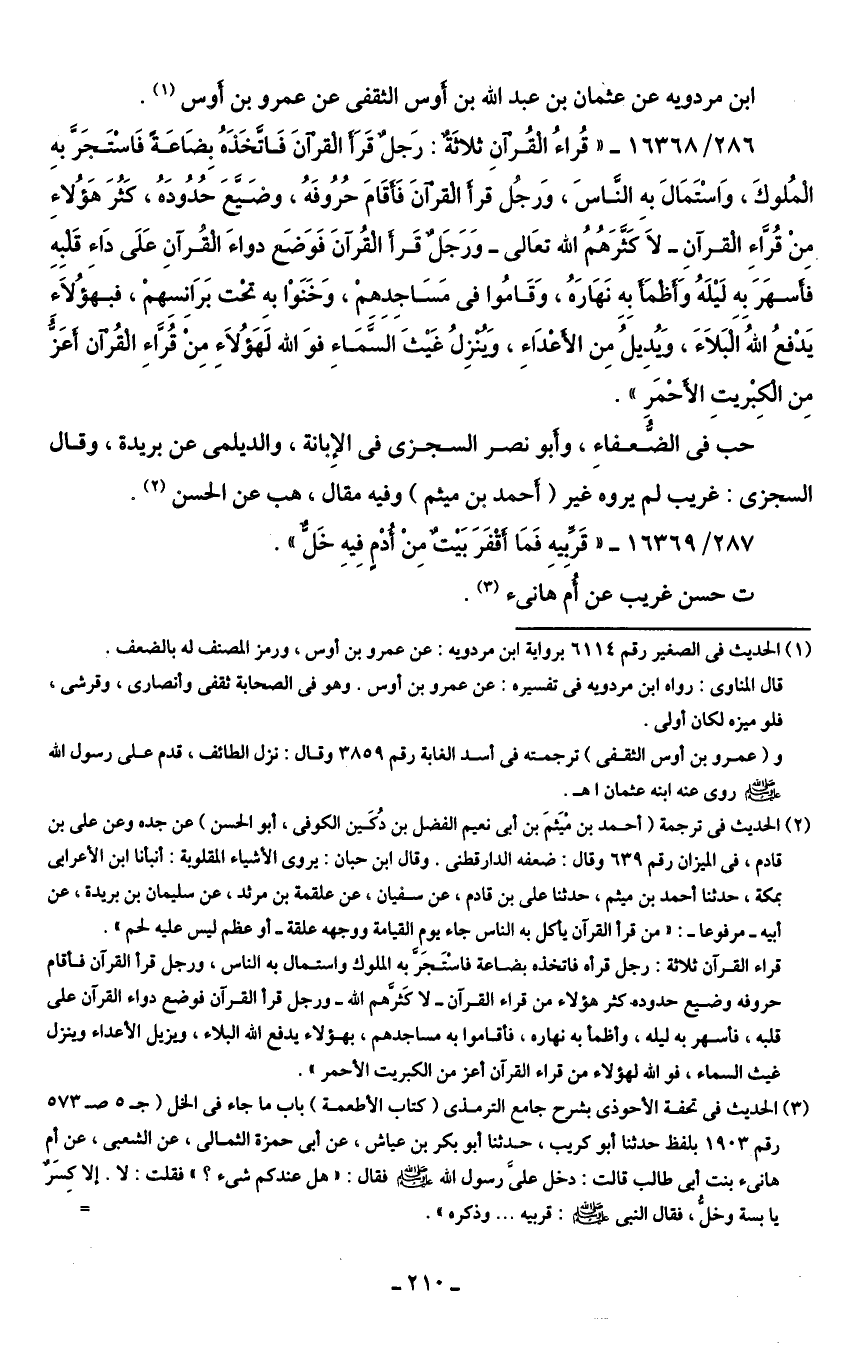 286/ 16368 - "قُراءُ القُرْآنِ ثلاثَةٌ: رَجلٌ قَرَأَ القرْآنَ فَاتَّخَذَهُ بِضَاعَةً فَاسْتَجَرَّ بهِ الْمُلوكَ، وَاسْتَمَال بهِ النَّاسَ، وَرجُلٌ قرأَ القرْآنَ فَأَقَامَ حُرُوفَهُ، وضَيَّعَ حُدُودَهُ، كَثُرَ هَؤُلاءِ مِنْ قُرَّاءِ القرآنِ -لَا كَثَّرَهُمُ الله تعَالى- وَرَجَلٌ قَرأ القُرآنَ فَوَضَع دواءَ القُرآنِ عَلَى دَاءِ قَلْبِهِ فأَسهَرَ بِه لَيلَهُ وَأظْمَأَ بِهِ نَهَارَهُ، وَقَامُوا في مَسَاجِدِهمْ، وَخَنَوْا بهِ تحْت بَرَانِسِهمْ، فبهؤُلاء يَدْفعُ اللهُ الْبَلاءَ، وَيُدِيلُ مِن الأَعْدَاءِ، وَيُنْزِلُ غَيثَ السَّمَاءِ فُوَالله لَهَؤُلاءِ مِن قُرَّاءِ القُرْآن أَعَزُّ مِن الْكِبْريتِ الأَحْمَرِ".