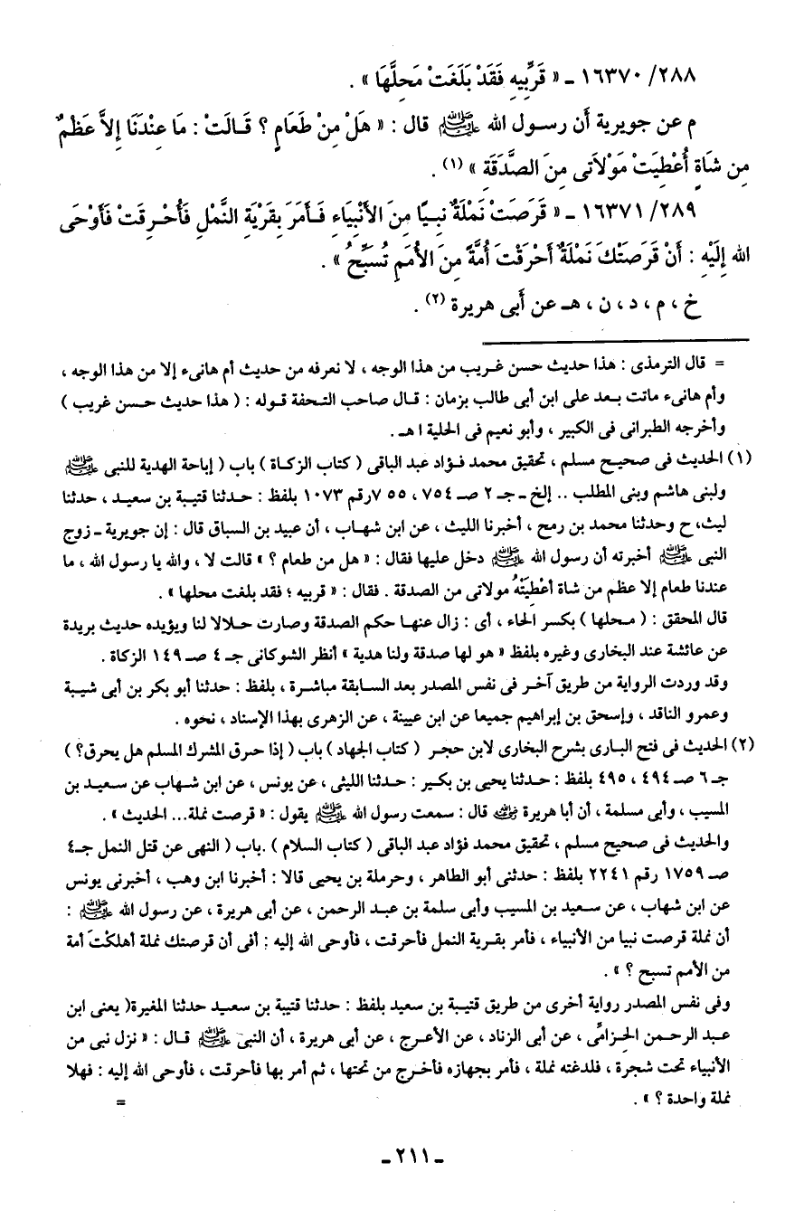 289/ 16371 - "قَرَصَتْ نَمْلَةٌ نبِيًا مِنَ الأَنْبِيَاءِ فَأَمَرَ بِقَرْيَةِ النَّمْلِ فَأُحْرِقَتْ فَأَوْحَى الله إِلَيهِ: أَنْ قَرَصَتْكَ نَمْلَةٌ أَحْرَقْتَ أُمَّةَ مِنَ الأُمَمِ تُسَبِّحُ".