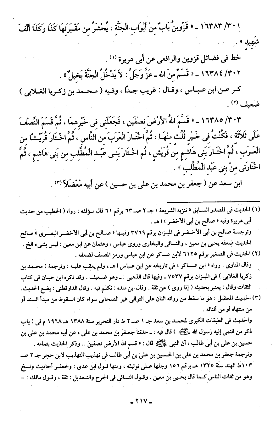 301/ 16383 - "قَزْوينُ بَابٌ مِنْ أَبْوَابِ الْجَنَّةِ، يُحْشَرُ مِنْ مَقْبَرَتِهَا كَذَا وَكَذَا أَلْفَ شَهِيدٍ".
