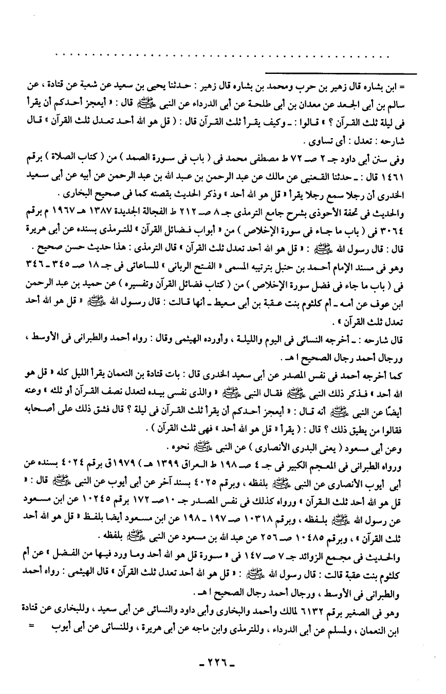 = ابن بشاره قال زهير بن حرب ومحمد بن بشاره قال زهير: حدثنا يحيى بن سعيد عن شعبة عن قتادة، عن سالم بن أبي الجعد عن معدان بن أبي طلحة عن أبي الدرداء عن النبي - صلى الله عليه وسلم - قال: "أيعجز أحدكم أن يقرأ في ليلة ثلث القرآن؟ " قالوا: - وكيف يقرأ ثلث القرآن قال: (قل هو الله أحد تعدل ثلث القرآن" قال شارحه: تعدل: أي تساوى.
