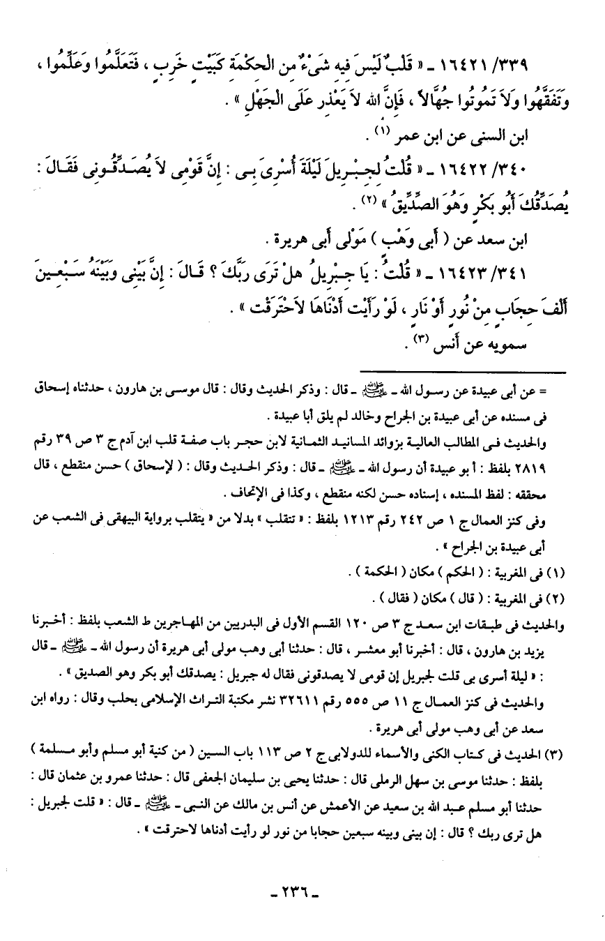 341/ 16423 - "قُلْتُ: يَا جِبْرِيلُ هلْ تَرَى رَبَّكَ؟ قَال: إِنَّ بَينِى وَبَينَهُ سَبْعِينَ أَلْفَ حِجَابٍ مِنْ نُورٍ أَوْ نَارٍ، لَوْ رَأَيت أَدْنَاهَا لاحْتَرَقْت".