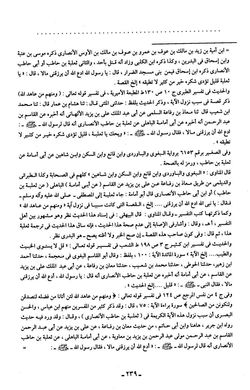 قال المناوى: "البغوي والباوردى وابن قانع وابن السكن وابن شاهين" كلهم في الصحابة وكذا الطبراني والديلمى من طريق معاذ بن رفاعة عن علي بن يزيد عن القاسم (عن أبي أمامة) الباهلى (عن ثعلبة بن حاطب) أو ابن أبي حاطب الأنصاري قال أبو أمامة: جاء ثعلبة إلى المصطفى - صلى الله عليه وآله وسلم - فقال: يا نبي الله ادع الله أن يرزقنى. إلخ، القصة التي كانت سببا في نزول آية {وَمِنْهُمْ مَنْ عَاهَدَ اللَّهَ} وكما ذكرتها كتب التفسير - وقال المناوى: قال البيهقي: في إسناد هذا الحديث نظر وهو مشهور بين أهل التفسير، اهـ، وقال: وأشار في الإصابة إلى عدم صحة هذا الحديث، فإنه ساق هذا الحديث في ترجمة ثعلبة هذا، ثم قال: وفي كون صاحب هذه القصة - إن صح الخبر ولا أظنه يصح - هو البدرى نظر.
