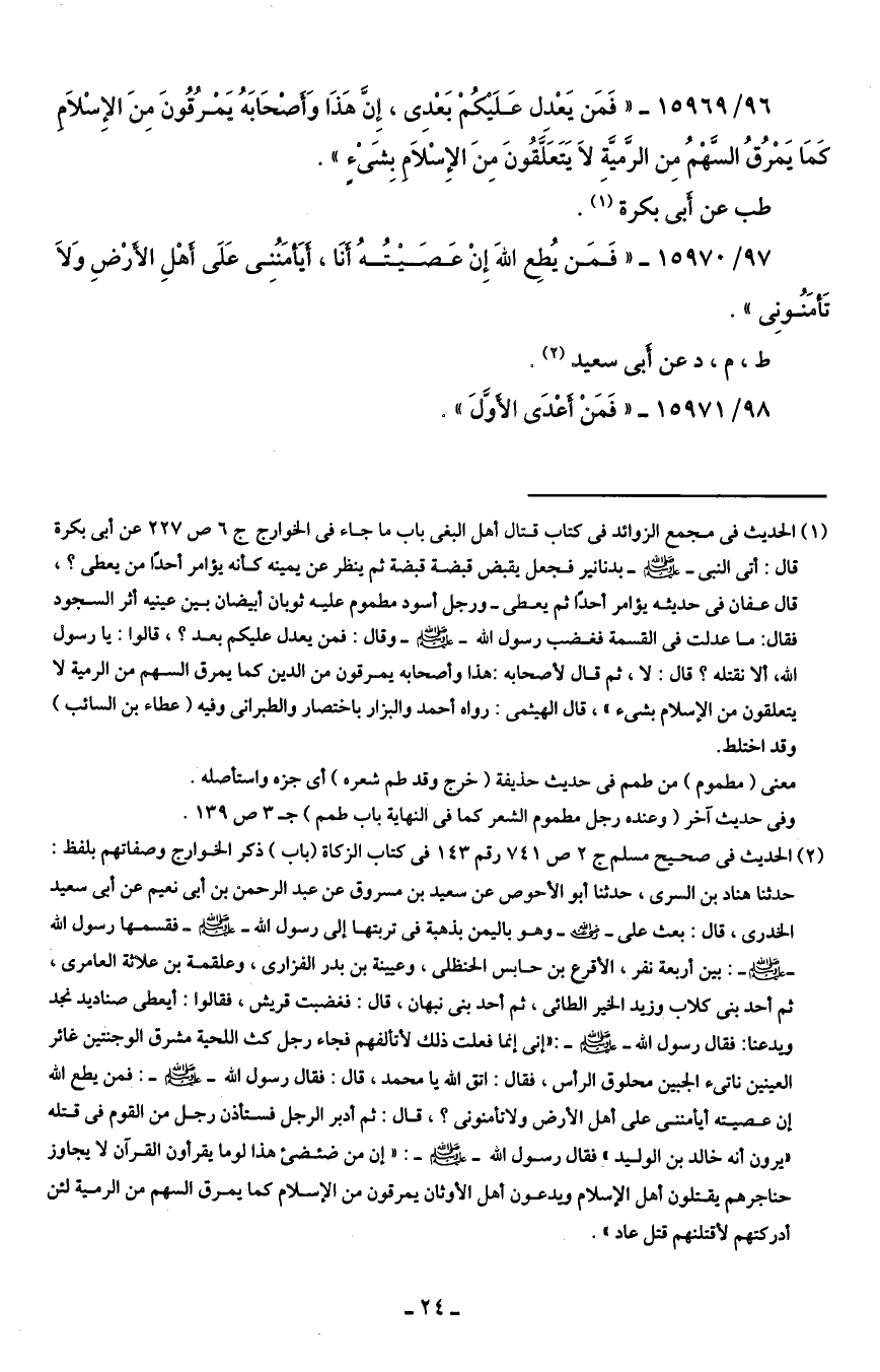 96/ 15969 - "فَمَن يَعْدل عَلَيكُمْ بَعْدِى، إِنَّ هَذَا وَأصْحَابَهُ يَمْرُقُون مِنْ الإِسْلامِ كَمَا يَمْرُقُ السَّهْمُ مِنْ الرَّميَّة لَا يَتَعَلَّقُونَ مِنْ الإِسْلامِ بِشَيْءٍ".