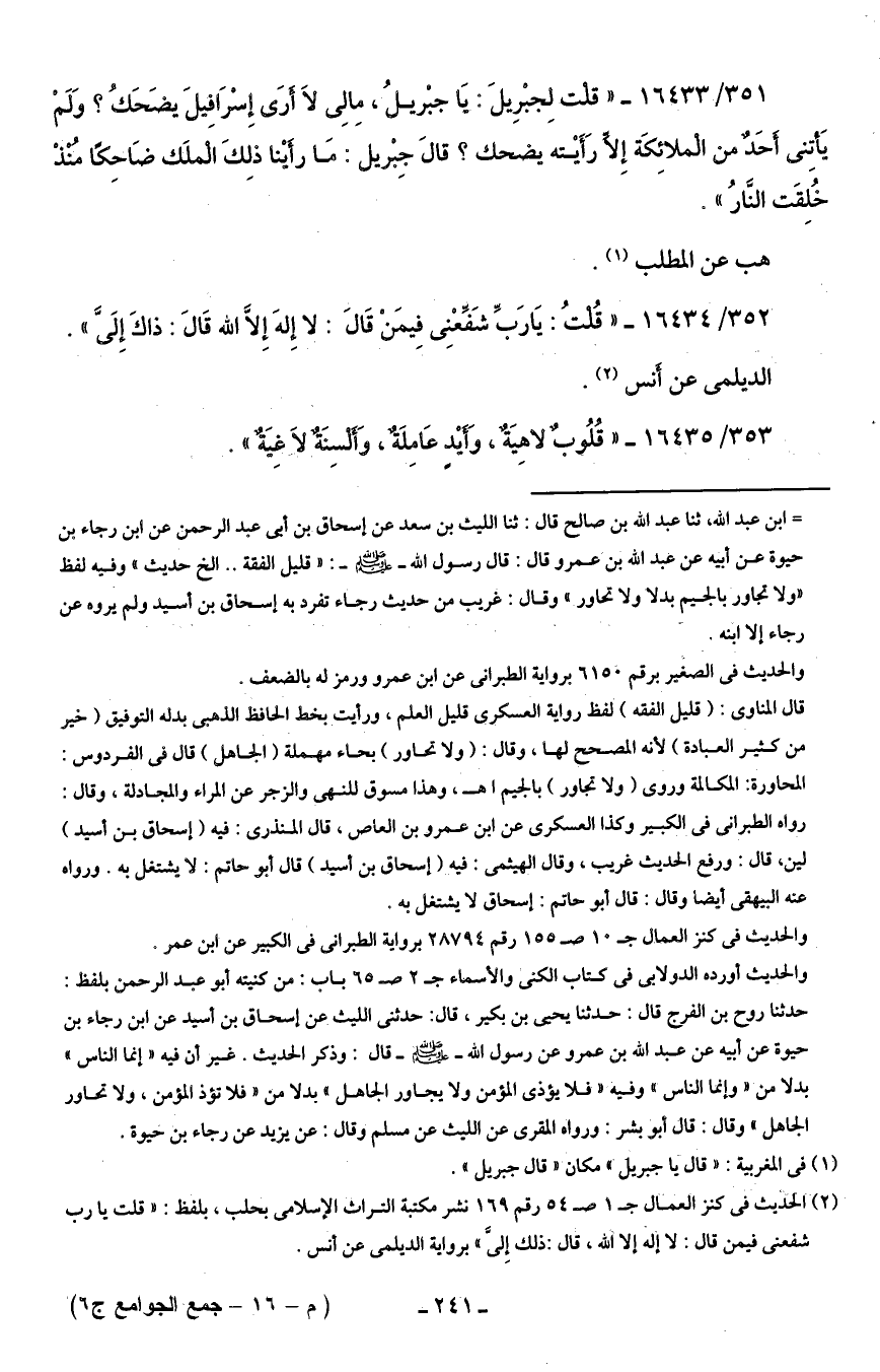 351/ 16433 - "قلت لِجبْرِيلَ: يَا جبْريلُ، ما لِي لَا أرَى إِسْرَافِيلَ يضَحَكُ"؟ وَلَمْ يَأتِني أَحَدٌ من الْملائِكَة إِلّا رَأَيته يضْحك؟ قال جِبْريل: مَا رأَينا ذلكَ الْملَك ضَاحِكًا مُنْذْ خُلِقَت النَّارُ".