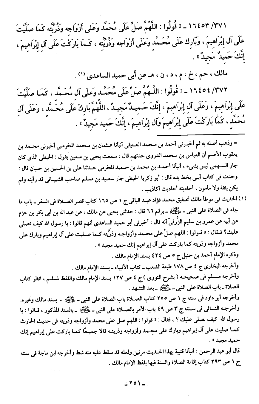 (¬1) الحديث في موطأ مالك تحقيق محمد فؤاد عبد الباقي ج 1 ص 165 كتاب قصر الصلاة في السفر - باب ما جاء في الصلاة على النبي - صلى الله عليه وسلم - برقم 66 قال: حدثني يحيى عن مالك، عن عبد الله بن أبي بكر بن حزم عن أبيه عن عمرو بن سليم الزُّرقيّ أنه قال: أخبرني أبو حميد الساعدى أنهم قالوا: يا رسول الله كيف نصلى عليك؟ فقال: "قولوا: اللهم صلِّ على محمد وأزواجه وذرِّيته كما صليت على آل إبراهيم وبارك على محمد وأزواجه وذريته كما باركت على آل إبراهيم إنك حميد مجيد".