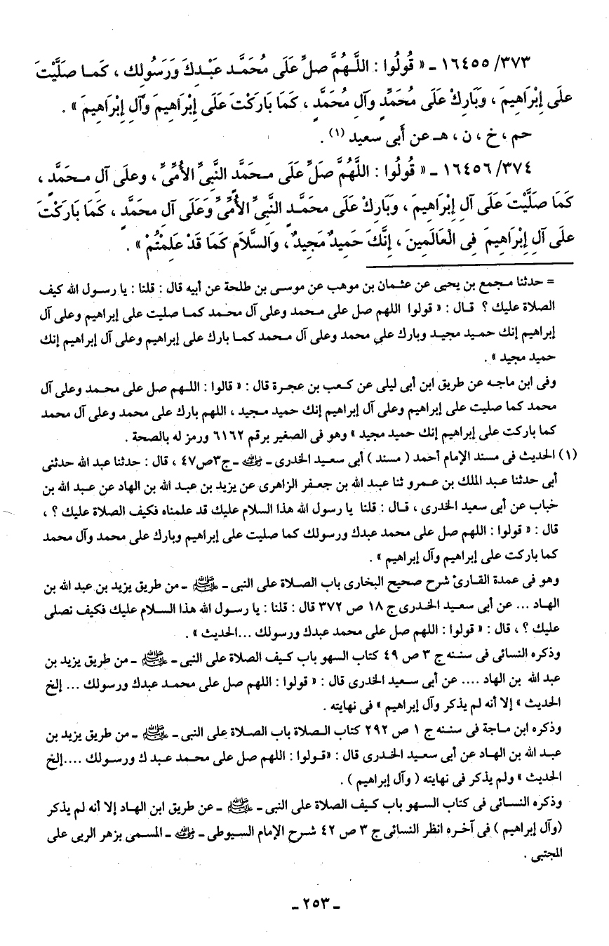 (¬1) الحديث في مسند الإمام أحمد (مسند) أبي سعيد الخدري - رضي الله عنه - ج 3 ص 47، قال: حدثنا عبد الله حدثني أبي حدثنا عبد الملك بن عمرو ثنا عبد الله بن جعفر الزاهرى عن يزيد بن عبد الله بن الهاد عن عبد الله بن خباب عن أبي سعيد الخدري، قال: قلنا يا رسول الله هذا السلام عليك قد علمناه فكيف الصلاة عليك؟ ، قال: "قولوا: اللهم صل على محمد عبدك ورسولك كما صليت على إبراهيم وبارك على محمد وآل محمد كما باركت على إبراهيم وآل إبراهيم".