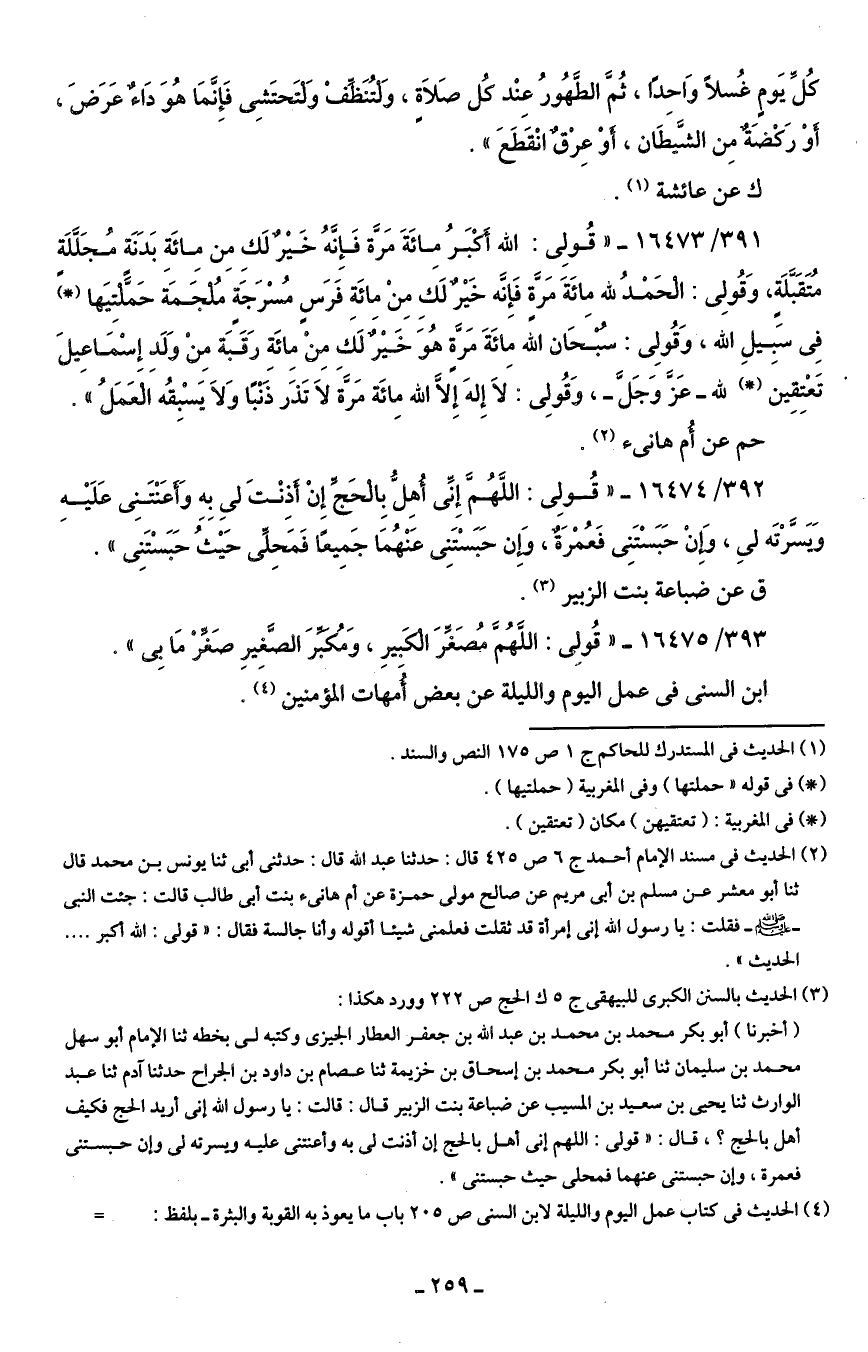 (¬2) الحديث في مسند الإمام أحمد ج 6 ص 425 قال: حدثنا عبد الله قال: حدثني أبي ثنا يونس بن محمد قال ثنا أبو معشر عن مسلم بن أبي مريم عن صالح مولى حمزة عن أم هانئ بنت أبي طالب قالت: جئت النبي - صلى الله عليه وسلم - فقلت: يا رسول الله إني إمرأة قد ثقلت فعلمنى شيئًا أقوله وأنا جالسة فقال: "قولي: الله أكبر. الحديث".