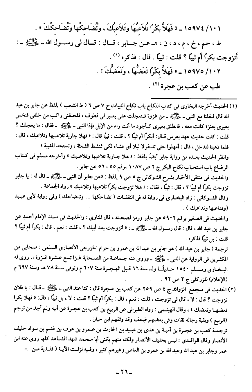 101/ 15974 - "فَهَلَّا بكْرًا تُلاعِبُهَا وتَلاعِبُكَ، وَتُضَاحِكُها وَتُضَاحِكُكَ".