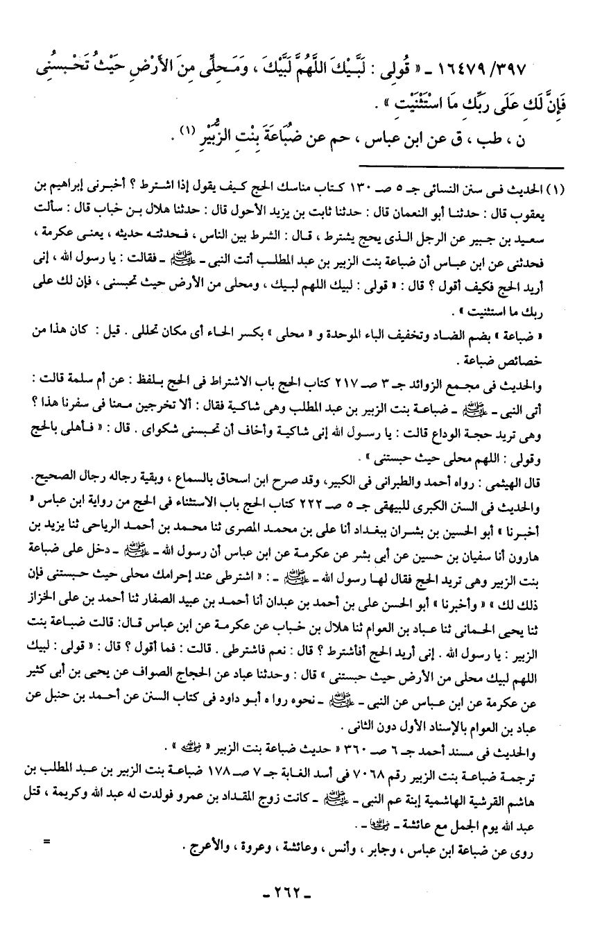 (¬1) الحديث في سنن النسائي جـ 5 صـ 130 كتاب مناسك الحج كيف يقول إذا اشترط؟ أخبرني إبراهيم بن يعقوب قال: حدثنا أبو النعمان قال: حدثنا ثابت بن يزيد الأحول قال: حدثنا هلال بن خباب قال: سألت سعيد بن جبير عن الرجل الذي يحج يشترط، قال: الشوط بين الناس، فحدثته حديثه، يعني عكرمة، فحدثنى عن ابن عباس أن ضباعة بنت الزبير بن عبد الطلب أتت النبي - صلى الله عليه وسلم - فقالت: يا رسول الله، إني أريد الحج فكيف أقول؟ قال: "قولي: لبيك اللهم لبيك، ومحلى من الأرض حيث تحبسنى، فإن لك على ربك ما استثنيت".