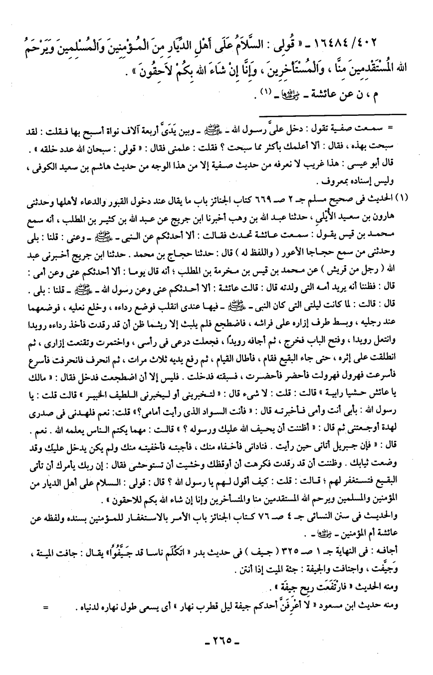 402/ 16484 - "قُولِى: السَّلامُ عَلَى أَهْلِ الدِّيَارِ مِنَ الْمُؤْمِنِينَ وَالْمُسْلِمِينَ وَيَرْحَمُ الله المُسْتَقْدِمِينَ مِنَّا، وَالْمُسْتَأخِرِينَ، وَإِنَّا إِنْ شَاءَ الله بِكُمْ لاحِقُونَ".