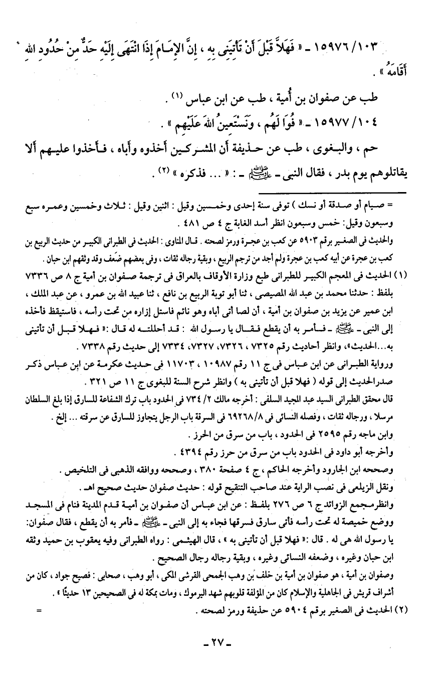 103/ 15976 - "فَهَلَّا قَبْلَ أنْ تَأتِيَنِى بِهِ، إِنَّ الإِمَامَ إِذَا انْتَهَى إِلَيهِ حَدٌّ مِنْ حُدُودِ اللهِ أقَامَهُ".