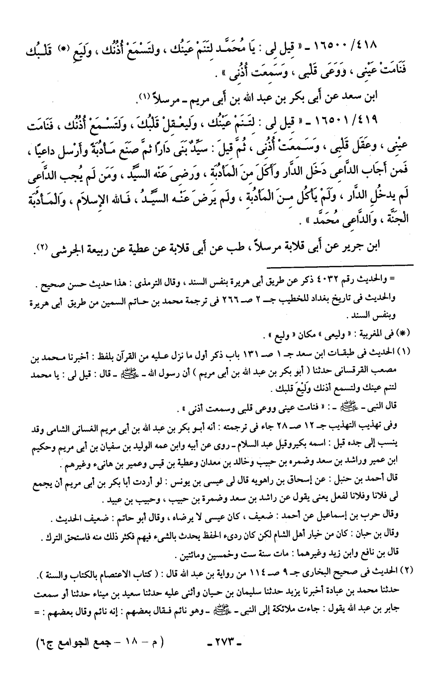 418/ 16500 - "قِيل لِي: يَا مُحَمَّد لِتَنَمْ عَينُك، ولتَسْمَعْ أُذُنُك، وَليَعِ (*) قَلْبُك فَنَامَتْ عَينِي، وَوَعَى قَلْبى، وَسَمِعَت أُذُنِى".