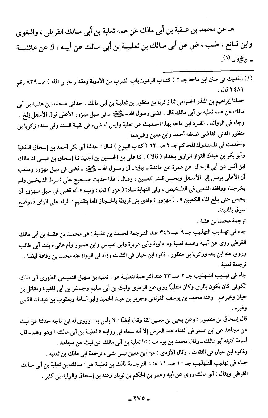 حدثنا إبراهيم بن المنذر الحزامى ثنا زكريا بن منظور بن ثعلبة بن أبي مالك. حدثني محمَّد بن عقبة بن أبي مالك عن عمه ثعلبه بن أبي مالك قال: قضى رسول الله - صلى الله عليه وسلم - في سيل مهزور الأعلى فوق الأسفل إلخ. وجاء في الزوائد. انفرد ابن ماجه بهذا الحديث عن ثعلبة وليس له شيء في بقية السند وفي سنده زكريا بن منظور المدني القاضي ضعفه أحمد وابن معين وغيرهما.