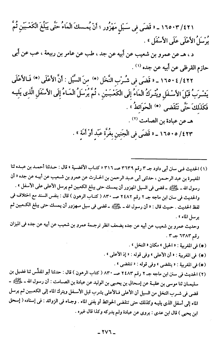422/ 16504 - "قَضَى فِي شُرْبِ النَّخْل (*) مِنَ السَّيل: أَنَّ الأَعْلَى (*) فَالأَعْلَى يَشْرَبُ قَبْلَ الأَسْفَلِ ويُتْرَكُ الْمَاءُ إِلَى الْكَعْبَينِ، ثُمَّ يُرْسَلُ الْمَاءُ إِلَى الأَسْفَلِ الَّذِي يَلِيه فَكَذَلِكَ حَتَّى تَنْقَضى (*) الْحَوَائِطُ".