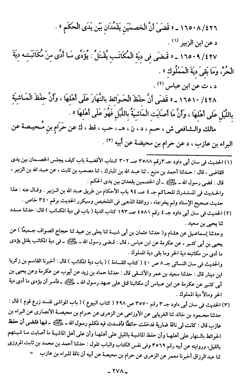 (¬3) الحديث في سنن أبي داود جـ 3 رقم 3570 ص 298 (كتاب البيوع) (باب المواشى تفسد زرع قوم) قال: حدثنا محمود بن خالد ثنا الغريابى عن الأوزاعي عن الزهري عن حرام بن محيصة الأنصاري عن البراء بن عازب قال: كانت لي ناقة ضارية فدخلت حائطًا فأفسدت فيه فكلم رسول الله - صلى الله عليه وسلم - فيها فقضى أن حفظ الحوائط بالنهار على أهلها وأن حفظ الماشية بالليل على أهلها وأن على أهل الماشية ما أصابت ما شيتهم بالليل، وروايته عن أبيه رقم 3569 وفي نفس الكتاب والباب تقول: حدثنا أحمد بن محمَّد بن ثابت المروزى ثنا عبد الرزاق أخبرنا معمر عن الزهري عن حرام بن محيصة عن أبيه أن ناقة للبراء بن عازب =