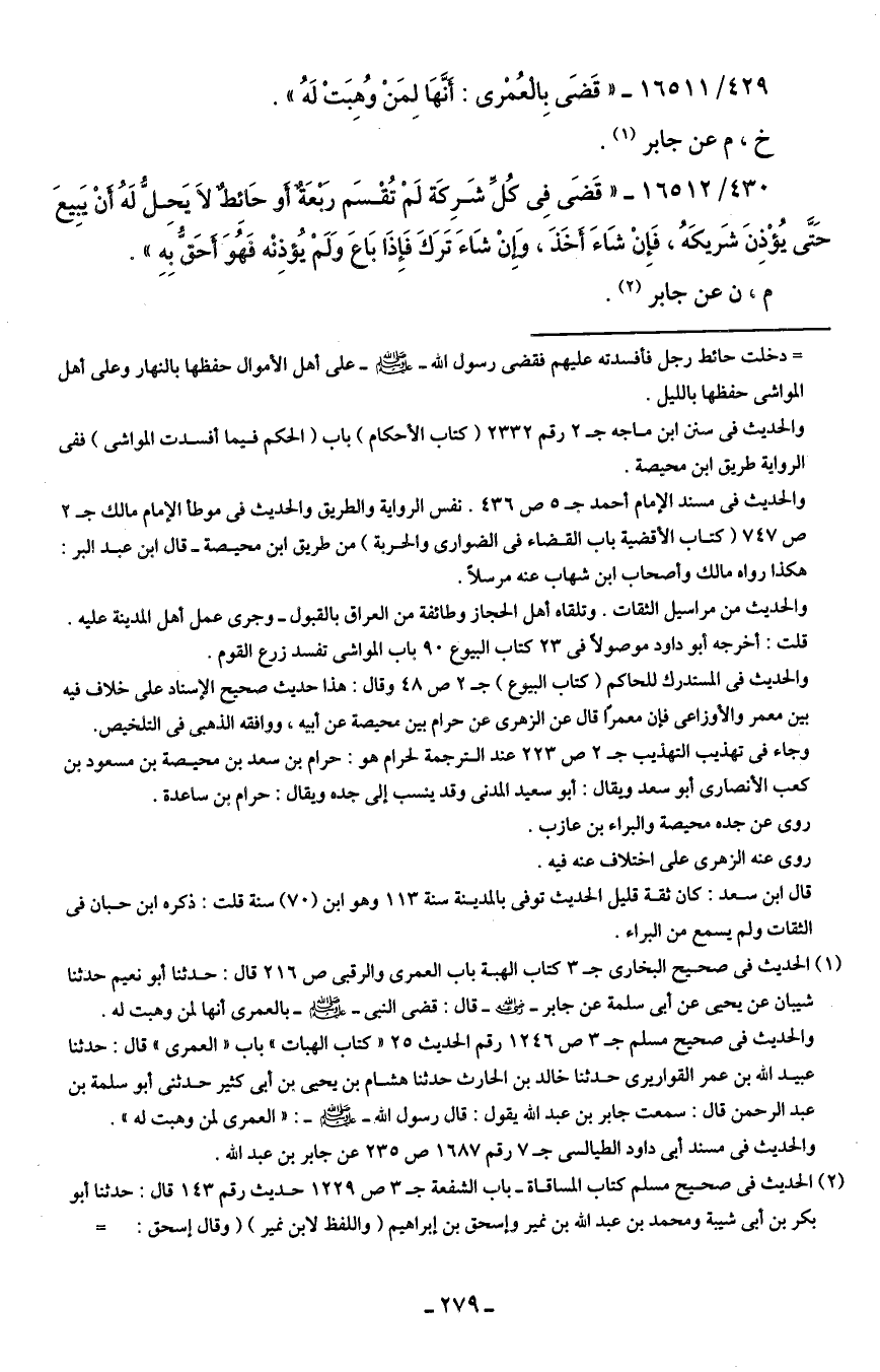 (¬1) الحديث في صحيح البخاري جـ 3 كتاب الهبة باب العمرى والرقبى ص 216 قال: حدثنا أبو نعيم حدثنا شيبان عن يحيى عن أبي سلمة عن جابر - رضي الله عنه - قال: قضى النبي - صلى الله عليه وسلم - بالعمرى أنها لمن وهبت له.