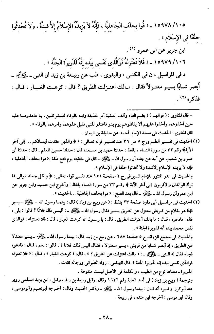 105/ 15978 - "فُوا بِحلْفِ الْجَاهِلِيَّةِ، فَإِنَّهُ لَا يَزِيدُهُ الإِسْلامُ إِلَّا شِدَّةً، وَلَا تُحْدِثُوا حِلفًا في الإِسْلام".
